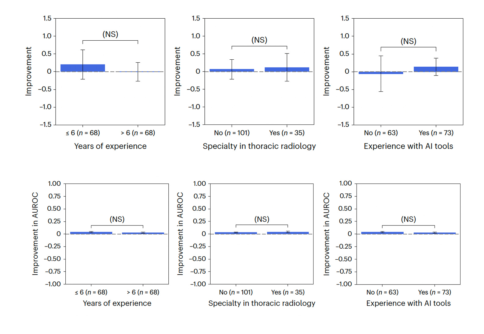 It’s never simple or straightforward when it comes to A.I. support, as we learned from Pranav Rajpurkar and colleagues in their paper this week that assessed 140 radiologists for performing 12 chest X-ray tasks. The incremental performance support with A.I. was highly variable and unpredictable. You would think the less experienced radiologists would derive more benefit from A.I. support, but that wasn’t the case, nor was specialty in chest radiology our experience with A.I. tools (Figure below). This study makes a case that individualized approaches may well be needed in order to promote the synergy between radiologists and A.I. tools, and that may be applicable across clinicians.