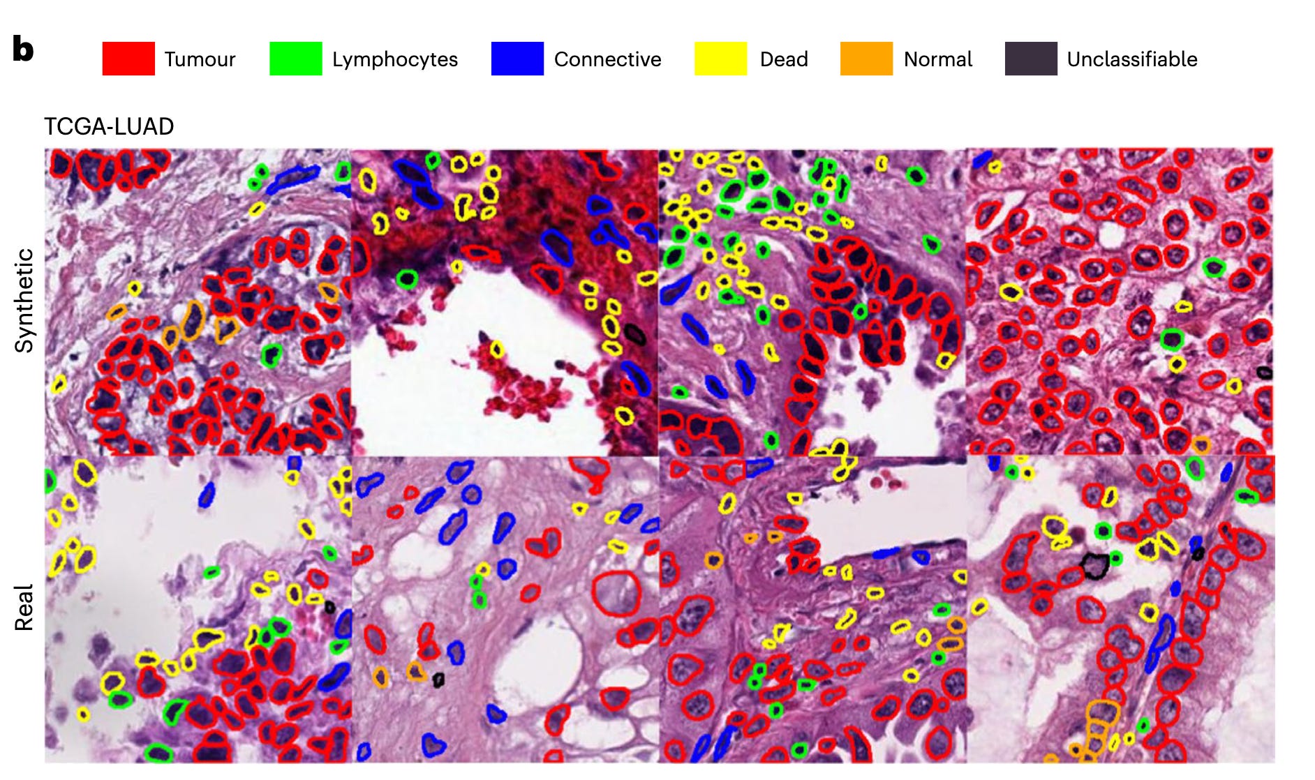 Oh, would you like to get a whole slide image from an RNA-seq? You can do that, too, from a diffusion model built by Olivier Gevaert and colleagues. It’s the DALL-E equivalent for generating path images. A real vs synthetic image set are shown below