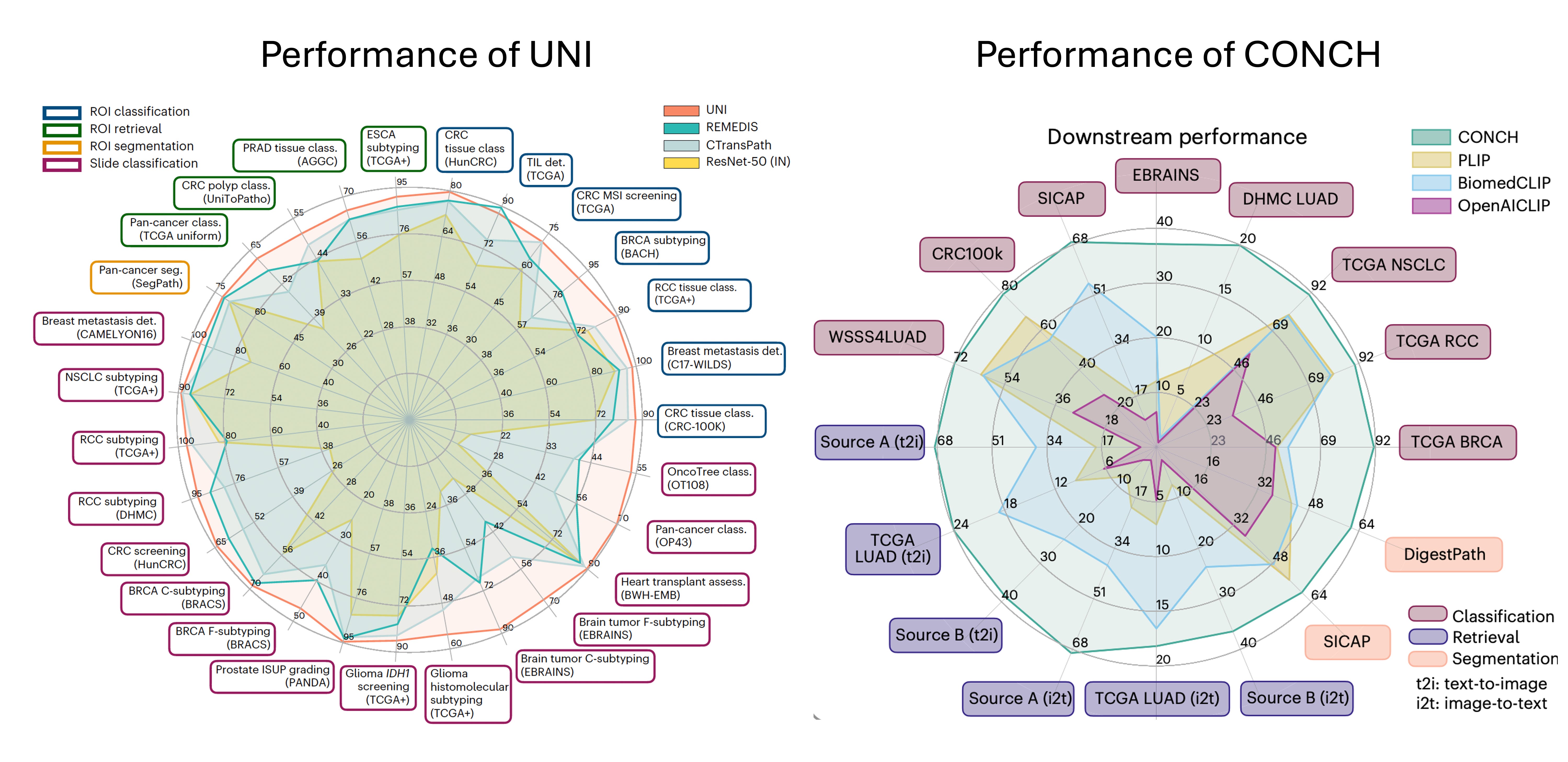 Faisal Mahmood and his colleagues at Harvard Med published 2 impressive foundation model pathology papers this week. With self-supervised A.I., UNI, pre-trained from >100,000 whole slide pathology images (comprised of >100 million images) for 20 major tissue types, exceeded performance of previous state-of-the-art pathology models for 34 computational pathology tasks, as shown on the left panel below. This is a nice step forward for a general-purpose pathology unimodal model.