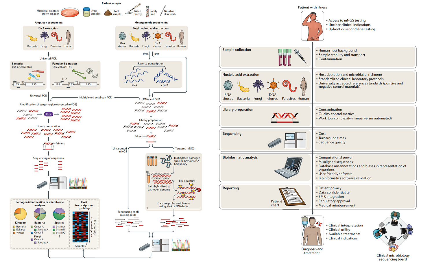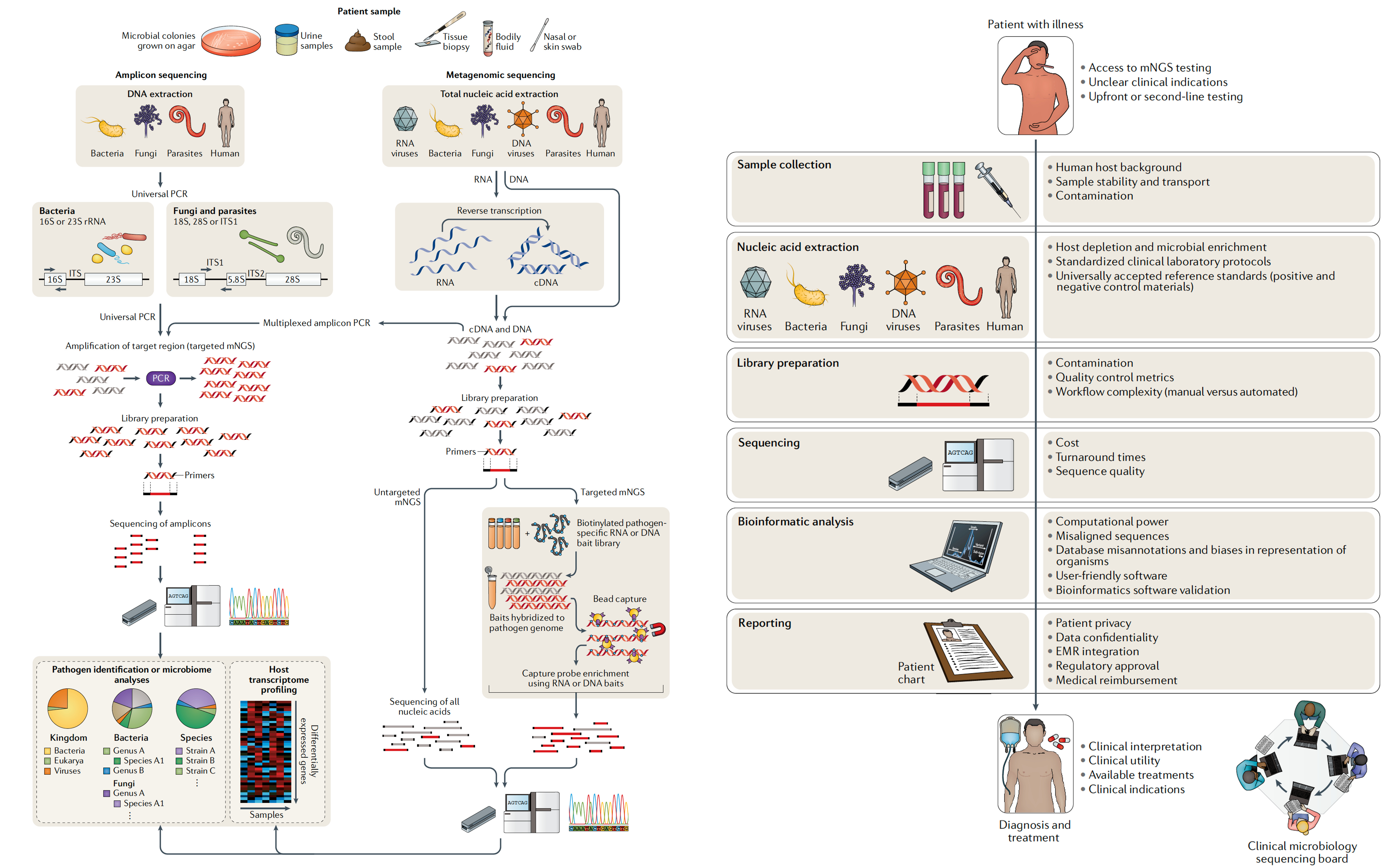 In contrast, “clinical metagenomics” as the field is known, takes an agnostic approach as to what is the causative pathogen. As shown in this excellent review, sequencing can be performed on any body fluid or tissue and there are several steps required, besides the sequencing, that include library preparation and bioinformatic analysis. There is no assumption about the bug—many cases successfully diagnosed by this technique would have been unthinkable pathogens, like an ameba, fungus or tuberculosis. The sequence tells the story in place of a clinician’s intuition for what might be the cause of infection.
