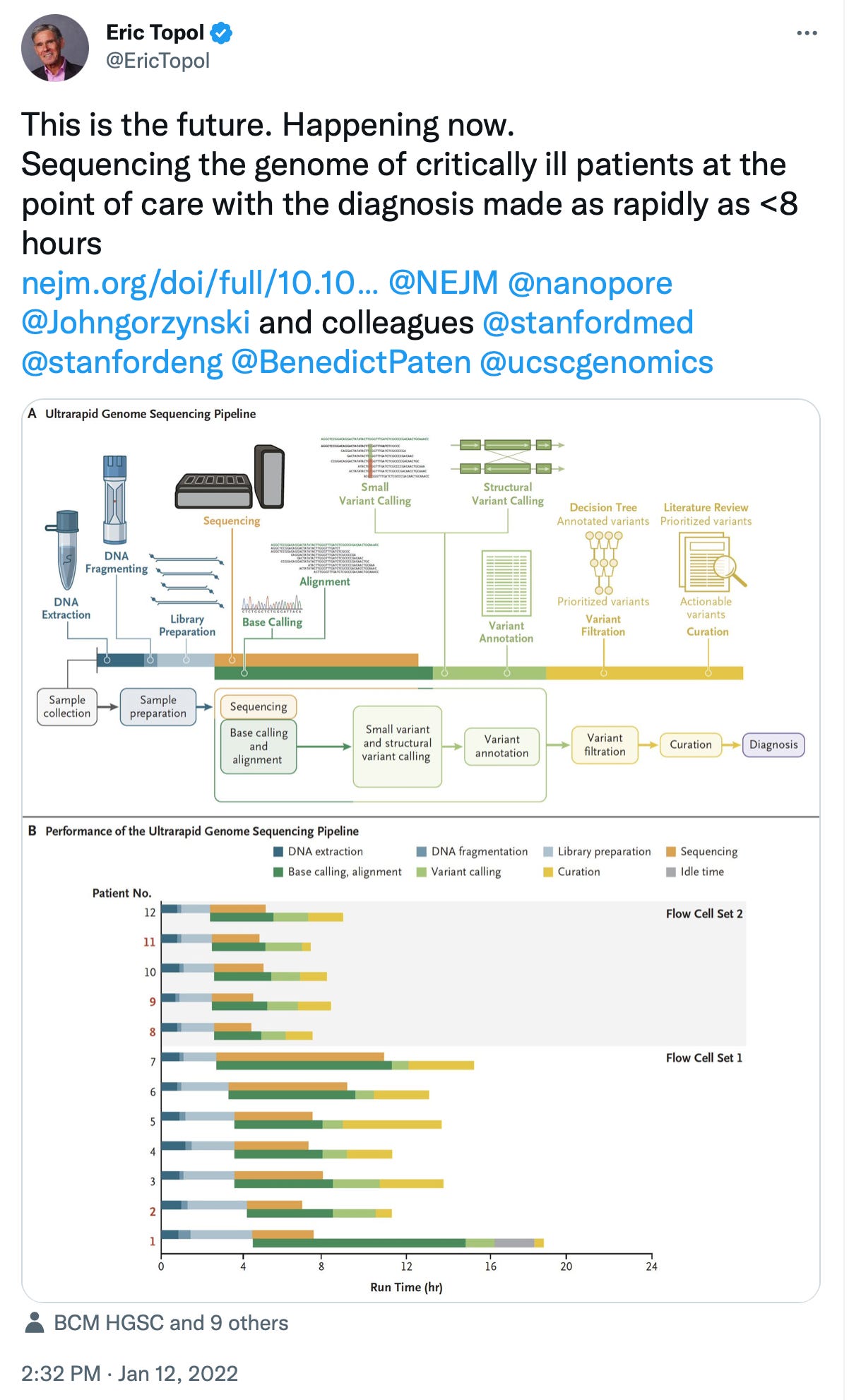 There has already been a published series of 34 patients in the intensive care unit in London where clinical metagenomics of the sputum within 8 hours led to the correct diagnosis with 92% sensitivity and 82% specificity, identifying unsuspected pathogens (such as Aspergillosis) and the anticipation of antibiotic resistance for bacterial infections. That workflow of 8 hours was also shown to be possible for whole genome sequencing of critically ill patients at Stanford University—not for infections but for undiagnosed illness via the host genome, a highly complex task. I posted about that earlier this year, a landmark achievement by Euan Ashley and colleagues.