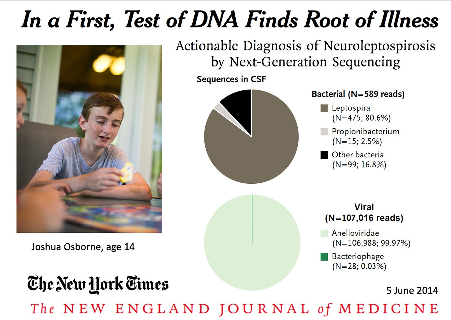In that same year, 2014, we saw the life saved of Joshua Osborne, who had sequencing of his cerebrospinal fluid finally establish (within 48 hours) the elusive diagnosis of leptospirosis after many weeks of an extensive battery of tests, including a brain biopsy, that had failed to establish the cause of his encephalitis. About half of such infections of the brain are left undiagnosed with current approaches which include lab screening for a variety of pathogens and culture of the cerebrospinal fluid.