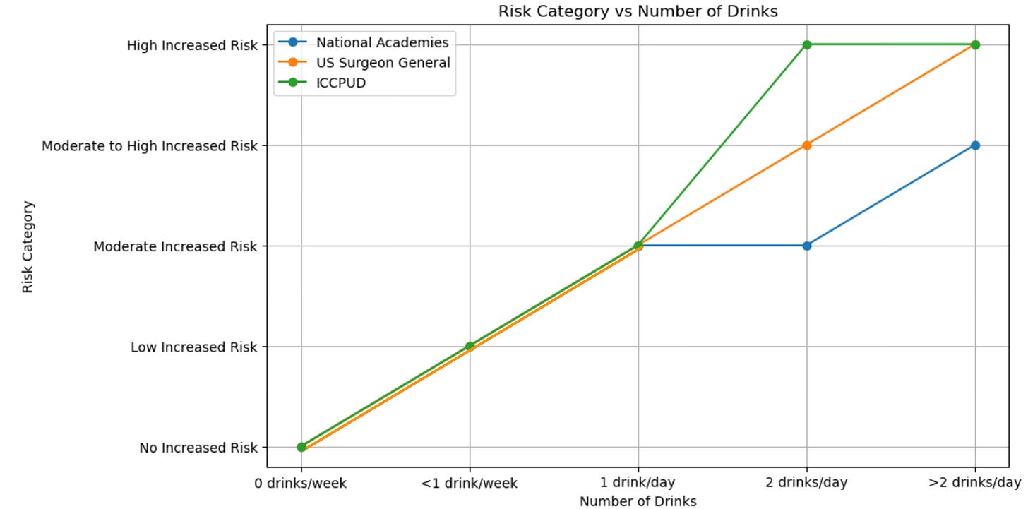 Beyond concordance that high consumption of alcohol poses health risks, and gender specificity (difference in amount of alcohol intake and relationship to risk for men vs women) the only main point of agreement for risk of alcohol intake and outcomes was for breast cancer in women, as seen in the graph above. Even with that you can see there was not agreement for the level of alcohol vs the magnitude of risk. For the National Academies report, the risk was only seen beginning with 1 drink/day among women. The Surgeon General and ICCPUD reports were concordant except for the magnitude of increased risk.