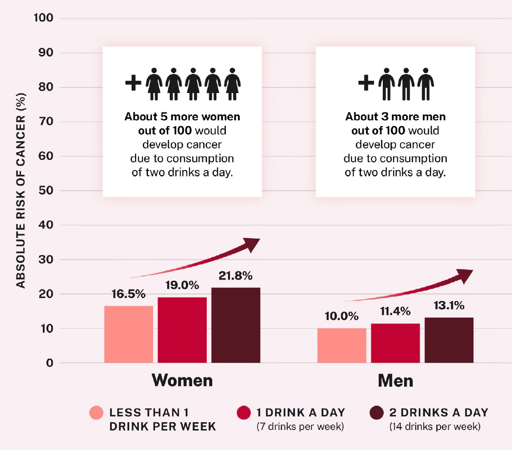 And the one thing we do see in the data is more alcohol means more cancer risk. And as you pointed out with, we see, especially when you're consuming at higher levels, a real increase in the risk of cancer. So that's how I would advise people just to think about this. And I think for somebody like, let's say like my wife who might have a drink on a birthday or on a special event from here and there over the course of the year, do I want her to be scared that somehow she's now in imminent danger of developing cancer if she drinks on a birthday or on a special holiday? No, I don't want her to be concerned about that. But I do think that the people should know the numbers and they should know what we're seeing in the trends. But I finally also want to draw attention to subpopulations.