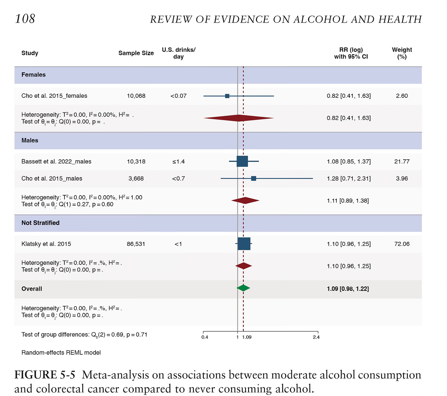 Both the ICCPUD and Surgeon General reports found increased risk, beginning at low levels of intake, for several cancers: oral, pharynx, larynx, liver, esophagus, colon. But the National Academes did not agree that the evidence for these associations was adequate, exemplified by the graph below for colon cancer, a non-significant ~9% increased risk (95% confidence intervals ranging from 0.96 to 1.22)