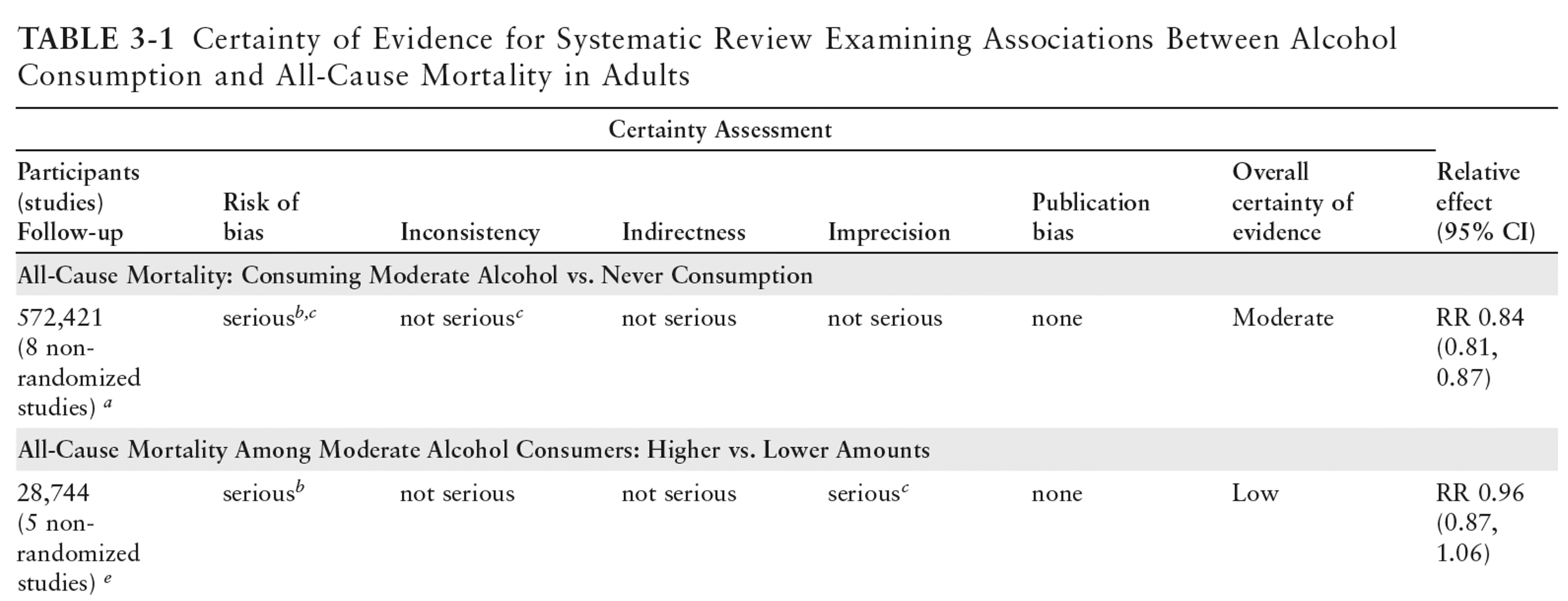 The report was requested by Congress and is unique among the three because it was a de novo comprehensive review of studies published in the past 15 years. The team raking through all the studies made a key call to address the potential confounder of “abstainer bias”—excluding former drinkers from the never drinkers subgroup. This was intended to provide a more accurate differentiation between moderate drinkers and lifelong non-drinkers. The data review for each endpoint was qualified with a level of certainty. The scope was not just cancer; it addressed neurodegenerative and cardiovascular outcomes, maternal alcohol consumption, all-cause mortality, and effect on body weight. Since there are no randomized controlled trials, no conclusion reached the level of high certainty. The report is 254 pages long with naming of its 14 authors and external review panel members of 10 experts.