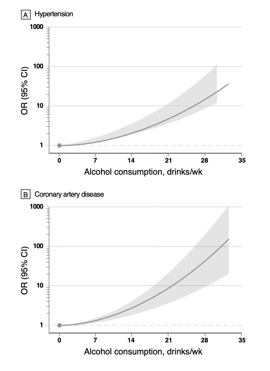 I mentioned that the ICCPUD review exclude studies using Mendelian randomization (MR) which actually are quite important because they have the potential to demonstrate or support causality, unlike observational studies. Notably, not it any of these reports is one such MR study with evidence of cause and effect for high intake of alcohol and hypertension and coronary artery disease (Graphs below, note these are log plots). I reviewed all of this in SUPER AGERS.