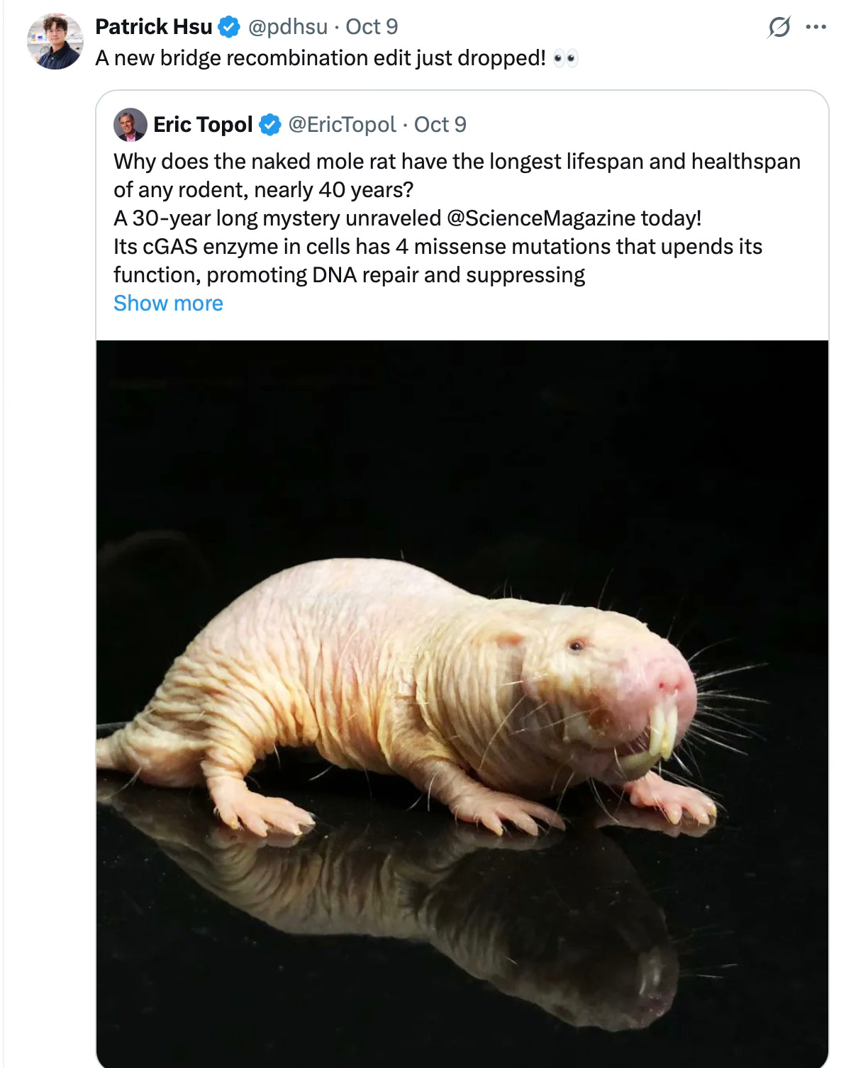 However, it’s much trickier to translate this to a way to promote healthspan and longevity in humans. The naked mole rat lives underground and has a radically different environmental exposure versus humans. It could theoretically tolerate the inability to sense foreign DNA of pathogens and be so well suited for prioritizing DNA repair and suppressing inflammation. If we could do a bridge recombination cGAS genome edit of the 4 amino acids, as Patrick Hsu quipped on X, (below) what might be in for? Serious infections? Autoimmune diseases?