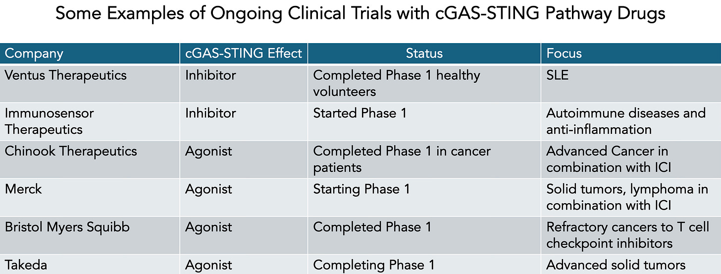 The very delicate balance of the ongoing clinical trials—to promote or block cGAS-STING—tells us about this tradeoff, and what could turn out to be a very narrow therapeutic window. Like a Goldilocks tale. On the other hand, these small molecules, both agonists and antagonists, appear to be very potent in vitro and well tolerated in Phase 1 studies, so we’ll have to see how they will pan out. It doesn’t have the look of the GLP-1 family of drugs which are all agonists of naturally occurring hormones and have outperformed all expectations to date (and likely more to come). I wish it were more straightforward for this class of drugs like the GLP-1s! It’s still very early for cGAS-STING pathway drugs, but watch this space.