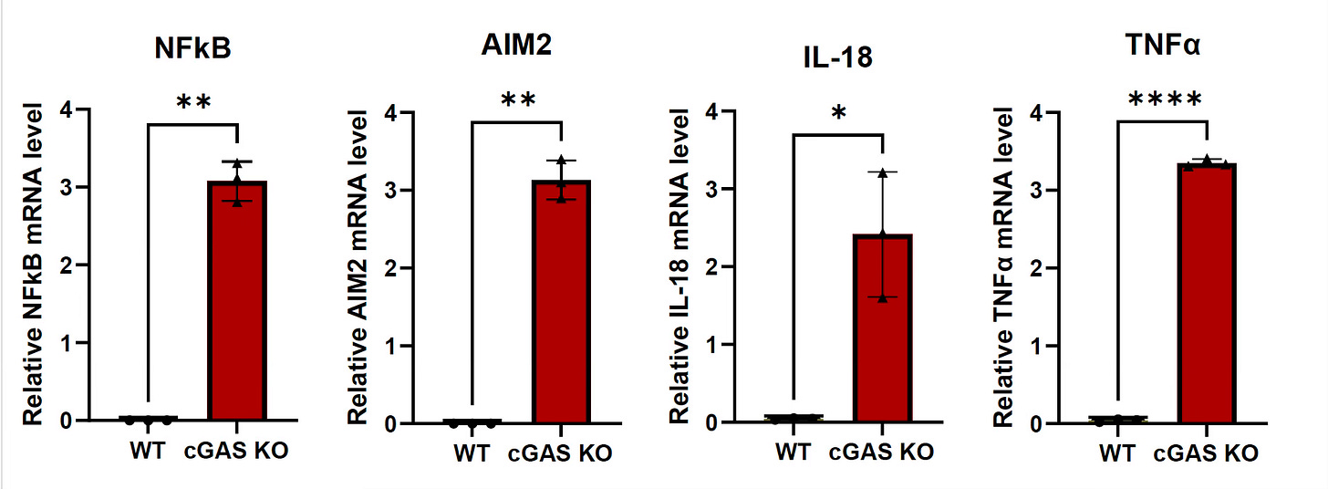 To sum up, the Science paper was a comprehensive assessment of the impact of naked mole rat’s cGAS in multiple species, with or without the 4 key mutations. Independent of the new report, a recent preprint by Martinez and colleagues looked at mice with knockout of cGAS (cGAS KO) and demonstrated shortened lifespan and increased inflammation in multiple organs, stemming from genomic instability (loss of chromatin organization and de-repression of transposable elements known as “jumping genes”).