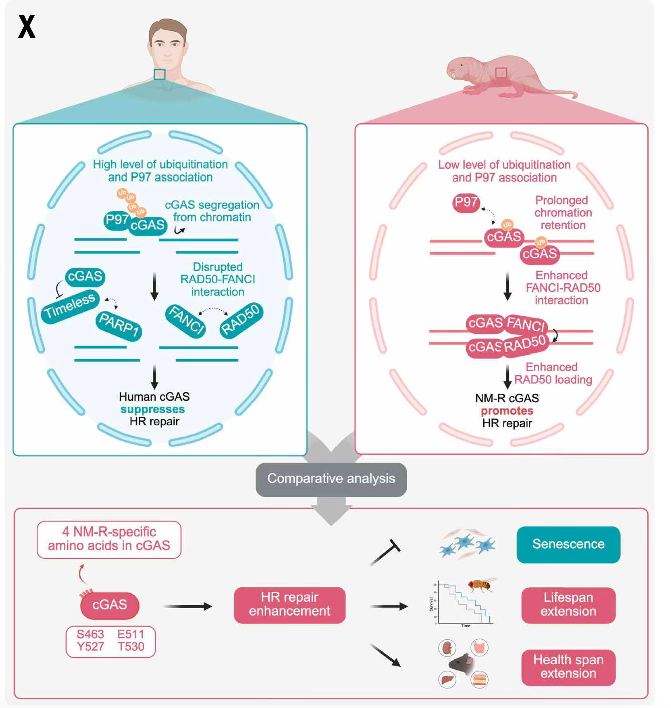 Accordingly, there are striking—opposite—changes between the function of cGAS in humans (and mice) compared with the naked mole rat, as schematically shown below. In humans without the 4 amino acid mutations, cGAS suppressed DNA repair. In naked mole rats, working through DNA repair factors P97, FANCI and RAD50, cGAS establishes tight binding of chromatin in the nucleus, HR promoting genome stability, and reducing inflammation.