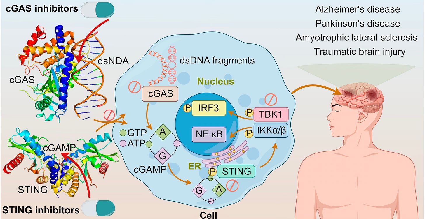 While this pathway is implicated in age-related diseases, the problem here is the duality of the therapeutic challenge. The path to Type 1 interferon production, the first line of defense of our innate immunity, further leads to immune cell recruitment and release of chemokines, which can be good or bad. On one hand, the cGAS sensor to detect DNA damage would seem vital for mounting defense against invading pathogens but also amping up anti-tumor immunity, which is why cGAS agonists are being developed vs cancer. On the other hand, blocking untoward self-directed immunity and chronic inflammation would be achieved by inhibitors of cGAS-STING. For example, cGAS-STING signaling has been tied to age-related macular degeneration, a leading cause of blindness, and systemic lupus erhythemosus (SLE). These could theoretically be prevented or suppressed by blocking the pathway. The field of neurodegenerative diseases is actively being pursued in preclinical work (Figure) with cGAS-STING blockers via many different small molecule (pill) drugs.