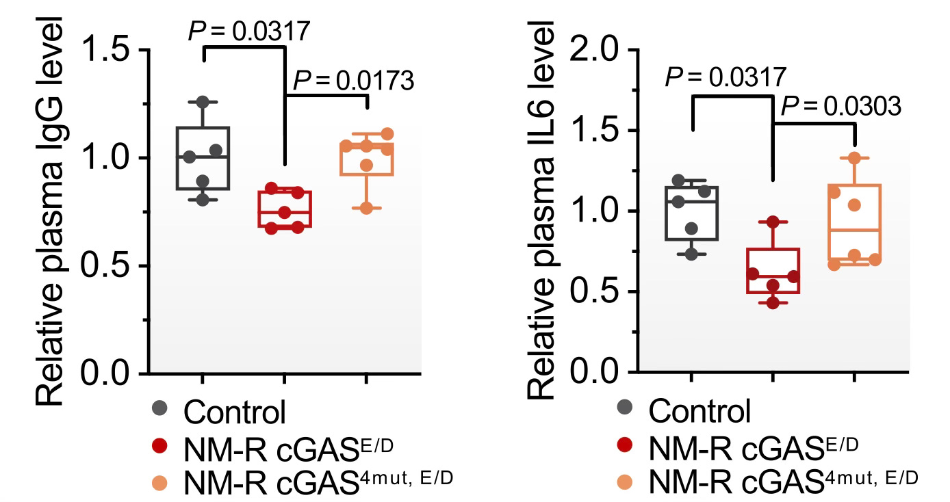 The unique naked mole rat cGAS (as expressed in cells and other organisms) had much less stress-induced cellular senescence, extended lifespan in fruit flies, and preempted organ degeneration in mice (via senescent markers in multiple organs), as further reflected by less frailty, less graying of hair, and significant reduction of blood levels of inflammation (Figure below, NM-R-naked mole rat, E/D is their 4 amino acid changed version and 4 mut, E/D is without the mutations) To further prove the impact of the 4 amino acid substitutions, these amino acid changes were reverted via human cGAS expression and all the protective effects were lost.
