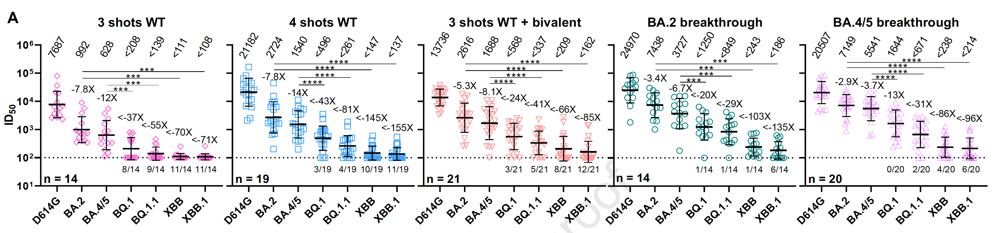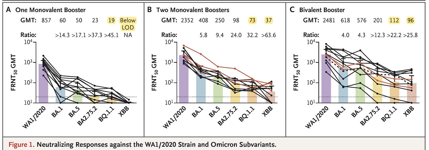 This week in NEJM, the Emory group published the data on the bivalent BA.5 booster and how it helped against XBB: "Persons who received the BA.5-containing bivalent booster had better neutralizing activity against all Omicron subvariants (especially against BA.2.75.2, BQ.1.1 and XBB) than those who received 1 or 2 monovalent [original] boosters." This finding of some cross-immunity protection has been backed up by live virus lab studies by 3 other groups.
