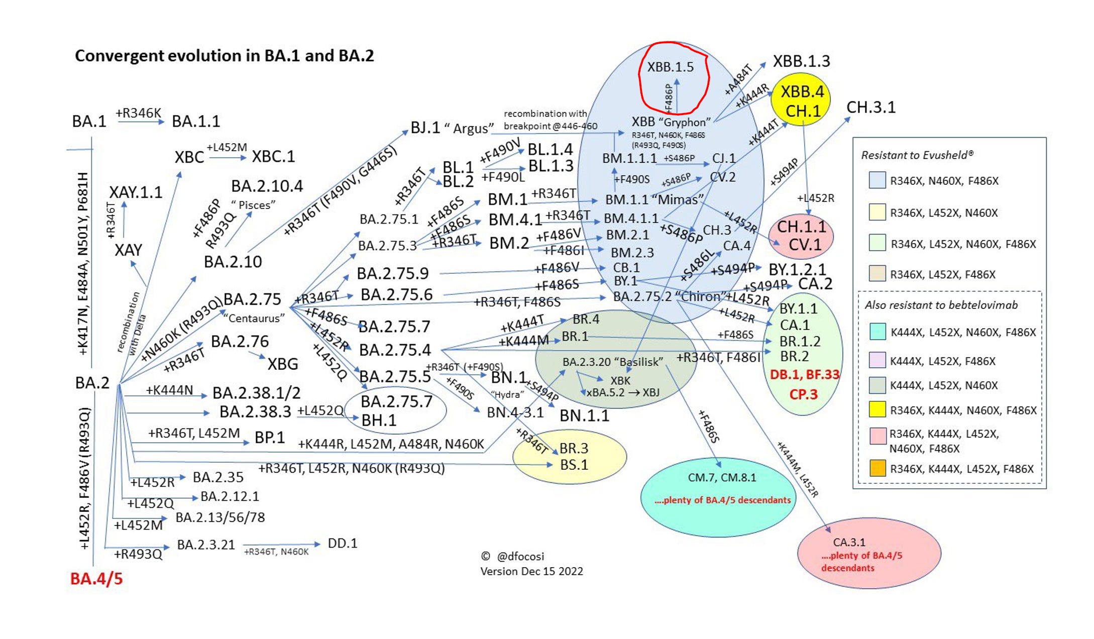 The key mutation of XBB.1.5 is clearly F486P, which had been identified many months ago by the Bloom lab as one that would be tied to immunity escape and Ryan Hisner wrote about extensively in August. As you can see from Daniele Focosi’s convergent variant map of the BA.2 descendants, XBB.1.5 is one to acquire the F486P mutation.
