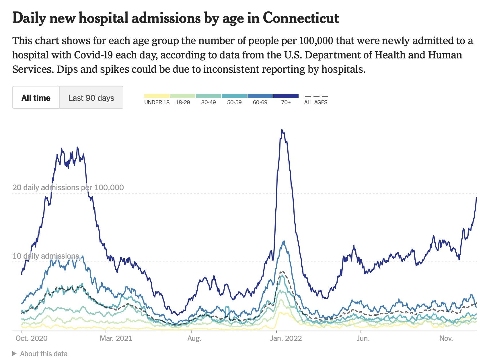 So we don’t know for sure how much of this is being driven by XBB.1.5, but it doesn’t look favorable. It is at the very least contributing—too much of a coincidence to see such a striking rise of the variant along with New York’s data. But only time will tell in the weeks ahead in contiguous states with XBB dominance how this will play out. Connecticut may indeed be showing the effect among people age 70+, as is New Jersey.
