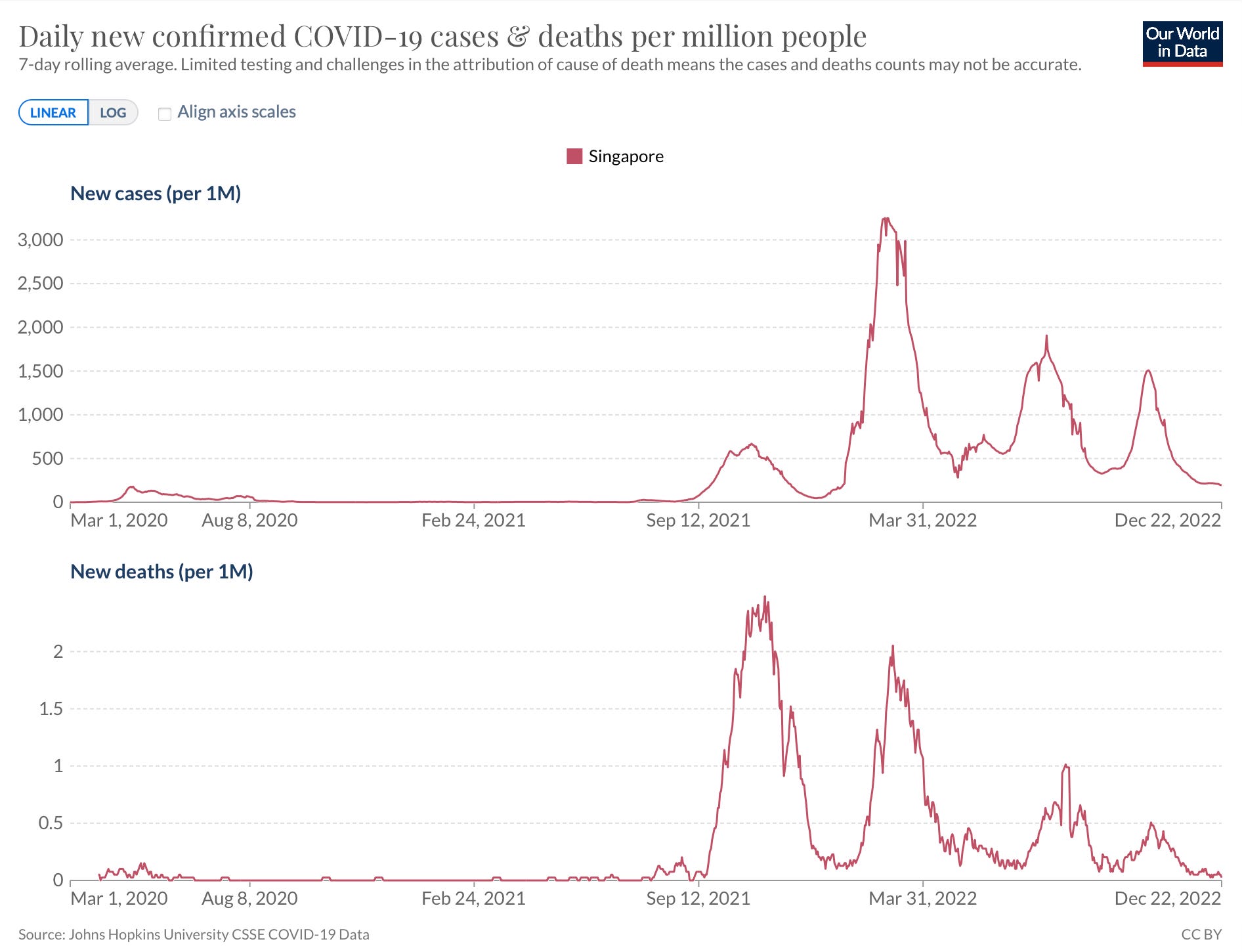 as shown here for cases and deaths. Fortunately, there was some uncoupling of the case-to-death ratio from its previous waves. It should also be noted that Singapore has one of the highest vaccination and booster rates in the world (compared with the United States below).