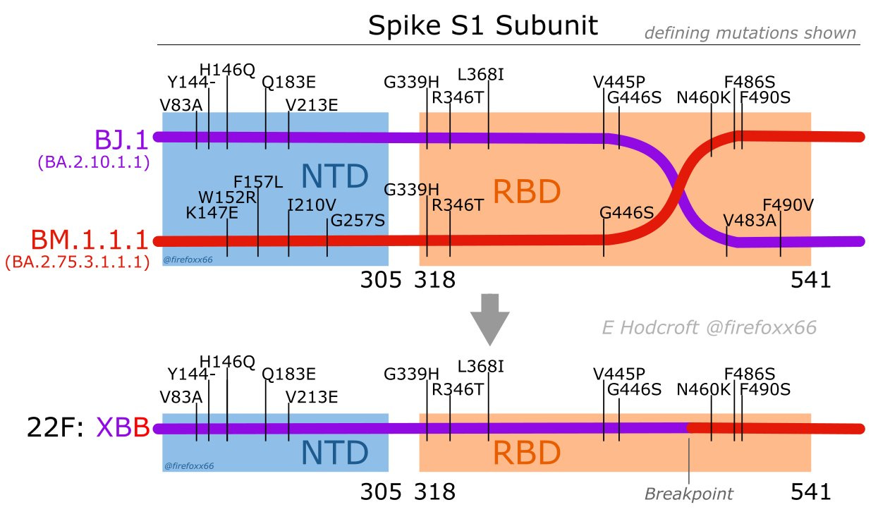Dr. Emma Hodcroft also has a terrific diagram to show the recombination between 2 variants that resulted in XBB