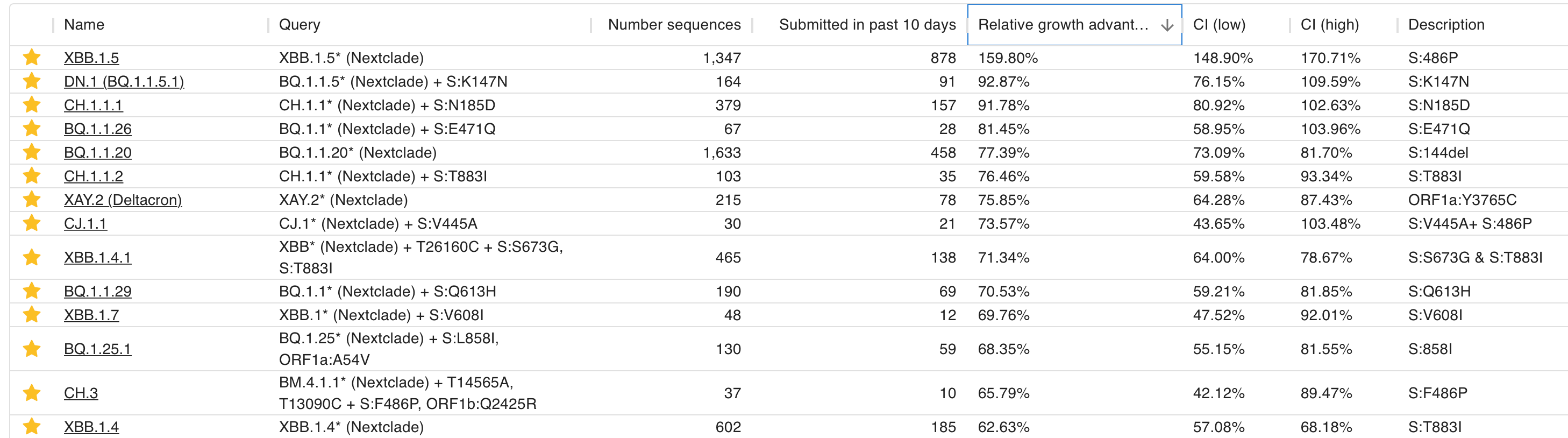 Of all the variants in the current mix, XBB.1.5 has the most growth advantage vs. BA.5 with substantial dropdown for the others as seen in the Cov-spectrum Table below, and a large number of sequenced samples to narrow the confidence intervals (CI).