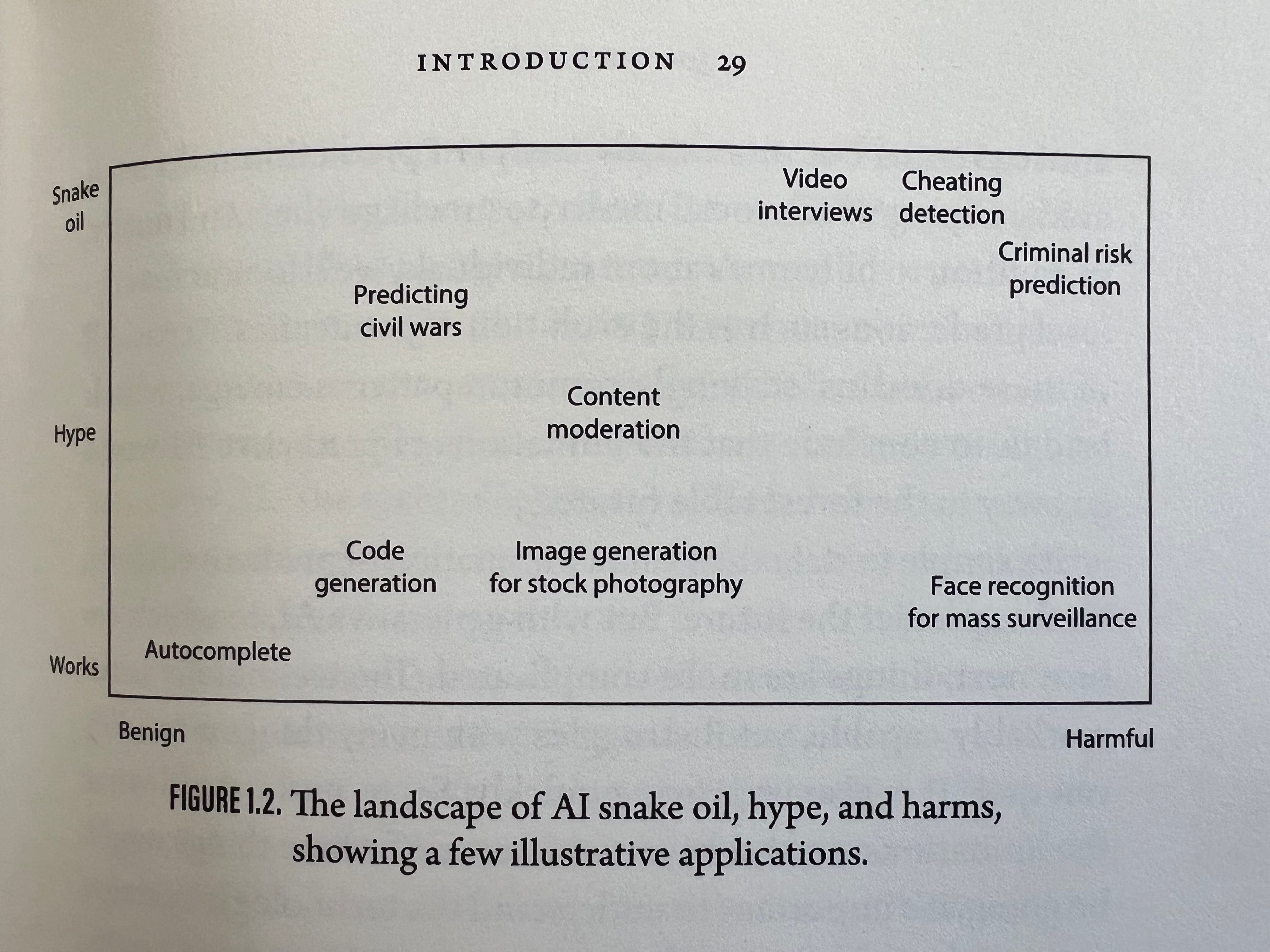 Yeah, and I agree with you on that point. I mean that was really a flagrant example and that would fulfill your title of your book, which as I said is a very tough title. But on page 29, and we'll have this in the post. You have a figure, the landscape of AI snake oil, hype, and harm.