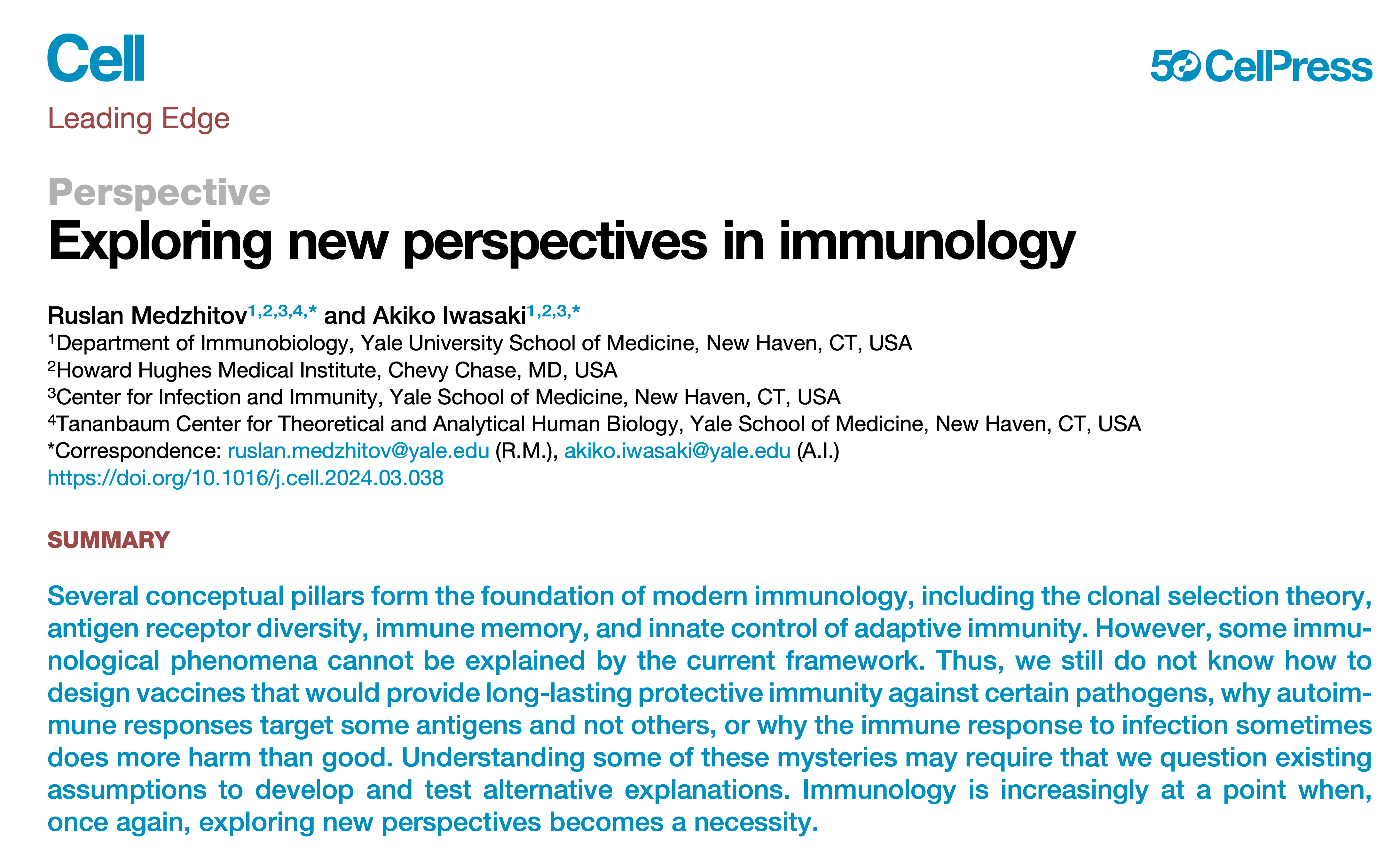 Yeah, so my husband Ruslan Medzhitov is a very famous immunologist who's in the same department, and we've written four or five review and opinion pieces together over the years. This new one is in Cell and it's really exploring new perspectives in immunology. We were asked by the editors to celebrate the 50th anniversary of the Cell journal with a perspective on the immune system. And the immune response is just a beautiful system that is triggered in response to specific pathogens and can really provide long-term or even sometimes lifelong immunity and resistance against pathogens and it really saves our lives. Much has been learned throughout the last 20, 30 years about the innate and adaptive immune system and how they're linked. In this new perspective, we are trying to raise some issues that the current paradigm cannot explain properly, some of the mysteries that are still remaining in the immune system.