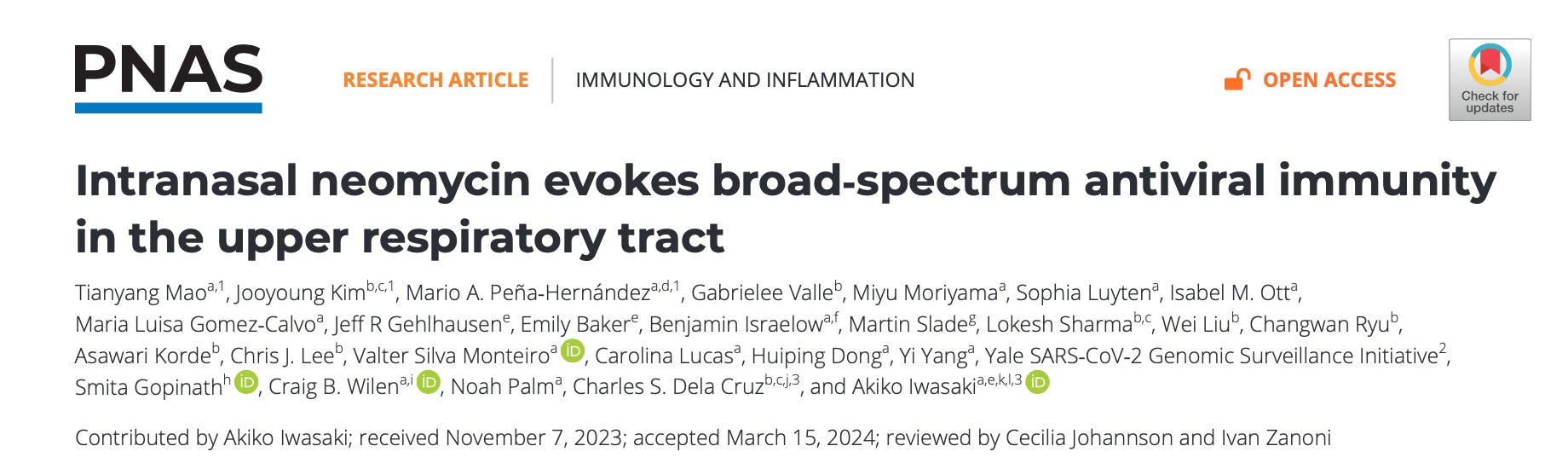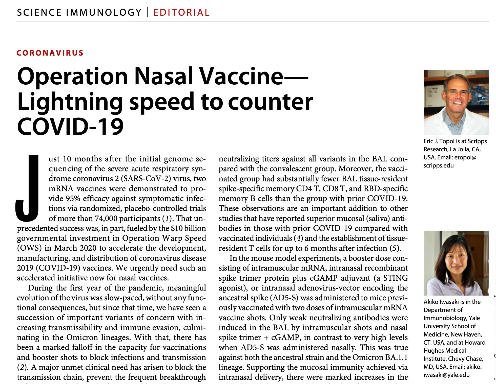 Yeah, I thought it was fascinating, and it does bring up, which I think has also been underdeveloped, is our approaches for interferon a frontline defense where augmenting that, just getting that exploiting the nasal mucosa, the entry site, whether it be through that means or of course through even more potent a nasal vaccine, it's like a missing, it's a hole in our whole defense of against this virus that's led to millions of people not just dying, but of course also sick and also with Long Covid around the world. So I hope that we'll see some progress, but I thought that was a really fascinating hint of something to come that could be very helpful in the meantime while we're waiting for specific nasal vaccines. Now added to all these things recently, like last week you published a paper in Cell with your husband who's in the same department, I think at Yale. Is that right? Can you tell us about that and this paper about the whole new perspectives in immunology?