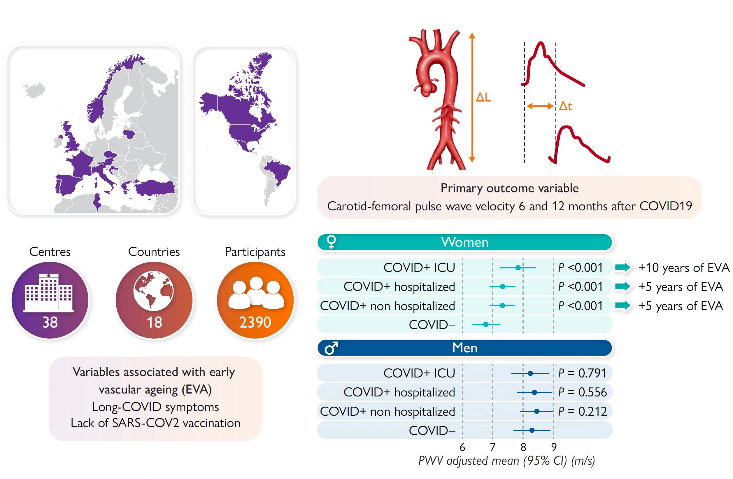 The new report is the first to demonstrate Covid’s impact on accelerated arterial aging. PWV has been used in previous small studies of Covid, but they were not adequately sized (largest had only 140 participants) or with the extent of follow-up as the present report. Particularly intriguing is the predominant effect in women, that is unexplained. We know the risk of Long Covid is greatly increased in women (~2/3rd of cases, if not higher) and that the immune system and propensity to inflammation has been tied to both two copies of the X chromosome (and the XIST gene that inactivates one of the X chromosomes) and hormonal factors, such as estrogen and progesterone. About 80% of autoimmune diseases occur in women. It is possible that there’s more propensity for endothelial inflammation after Covid in women compared with men, which sets up more chance of stiffness, fibrosis, and features of EVA. Another factor acknowledged by the authors is that there is less survivorship among men, a bias that could have contributed to the marked difference by sex.
