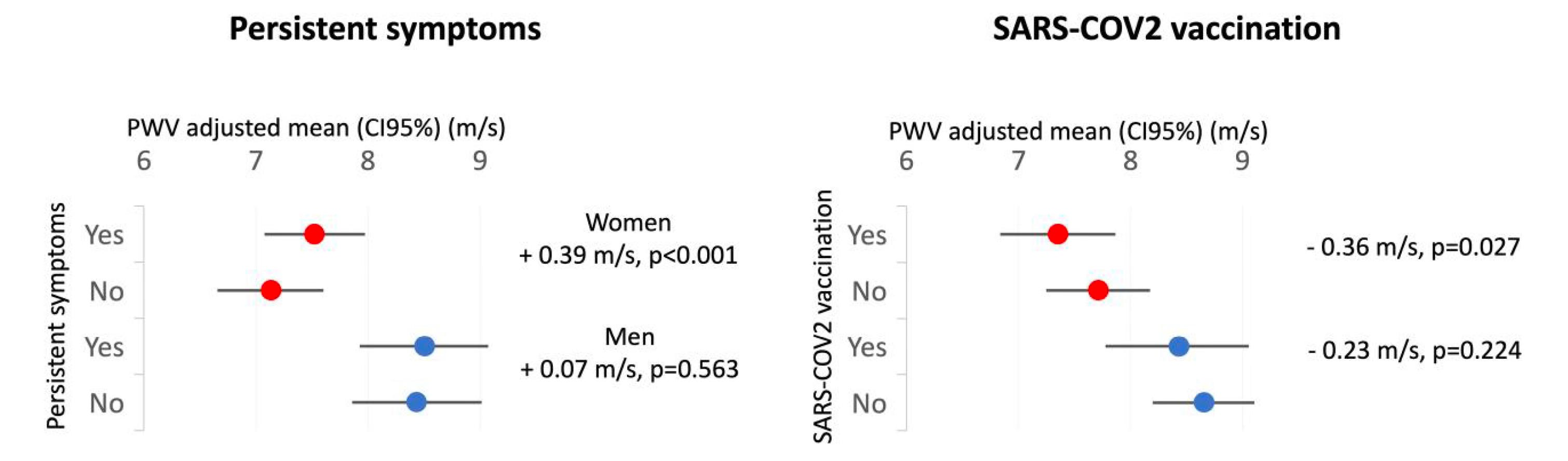 There were many important findings from this work. The acceleration of early (accelerated) vascular aging (EVA) was not proportionate to severity of COVID. Although participants who required ICU hospitalization had an estimate of 10 years of EVA, those who were not hospitalized had the same—5 years of accelerated arterial aging— as participants who did require hospitalization. The EVA effect was only significant in women and there was a statistically significant interaction term for Sex X EVA. Symptoms of Long Covid were linked to EVA and vaccination was associated with protection from EVA (graphs below, respectively). All of the analyses were adjusted for potential confounders. Some people with early EVA had resolution at 1-year follow-up. There was no assessment for reinfection and this prospective study was largely conducted early in the pandemic. The accompanying editorialist wrote: "The..study makes the case that Covid has aged our arteries, especially for females."
