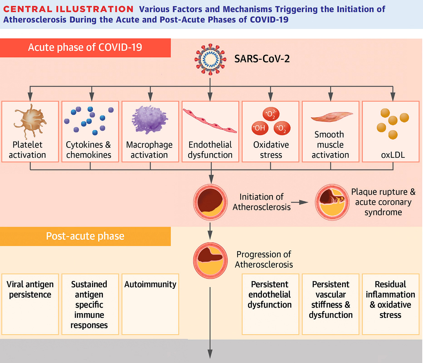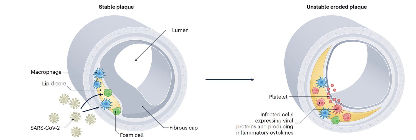 Specifically, in post-mortem coronary artery specimens in confirmed severe Covid patients there was detection of the virus in macrophages and foam cells along with the finding of the SARS-CoV-2 antisense strand replicating In these cells, composing an infection fo the blood vessel wall, marked inflammation, and potentiation of plaque instability (schematic below).