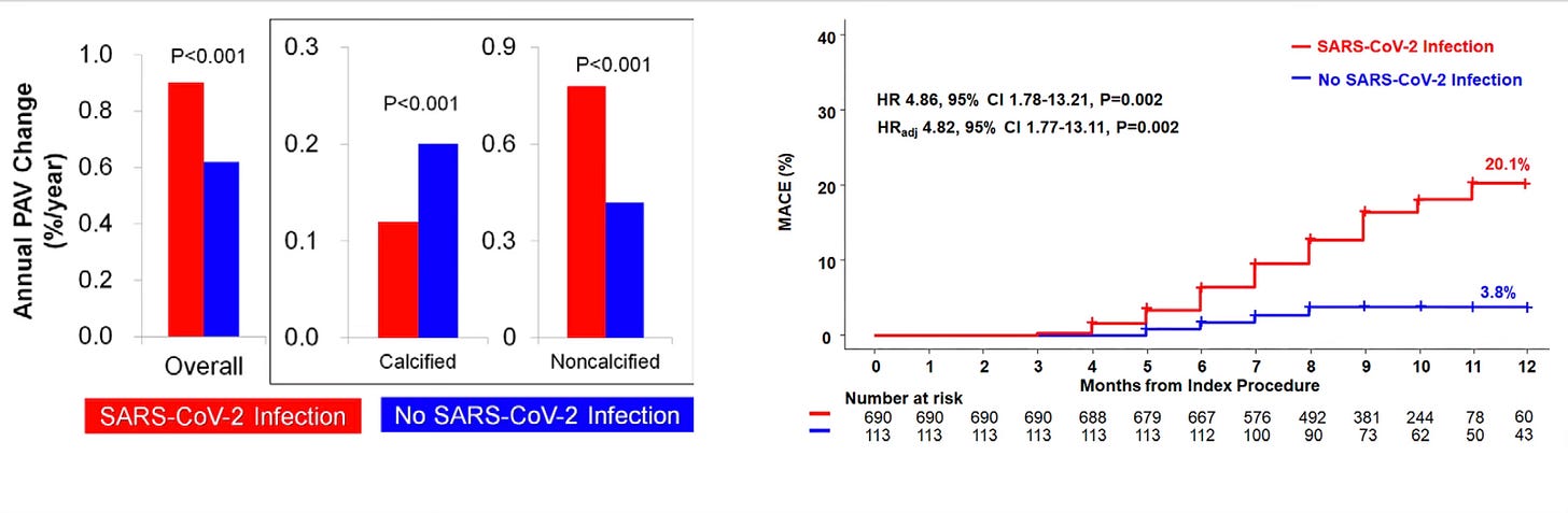 Recently, from patients with repeat CT coronary angiograms (690 with Covid, without hospitalization nad 113 controls, without Covid), there was evidence of more arterial plaque progression (left panel, for one metric below) to high-risk non-calcified plaques, increased inflammation, and more major adverse cardiovascular events (MACE) (right panel) among those with Covid.