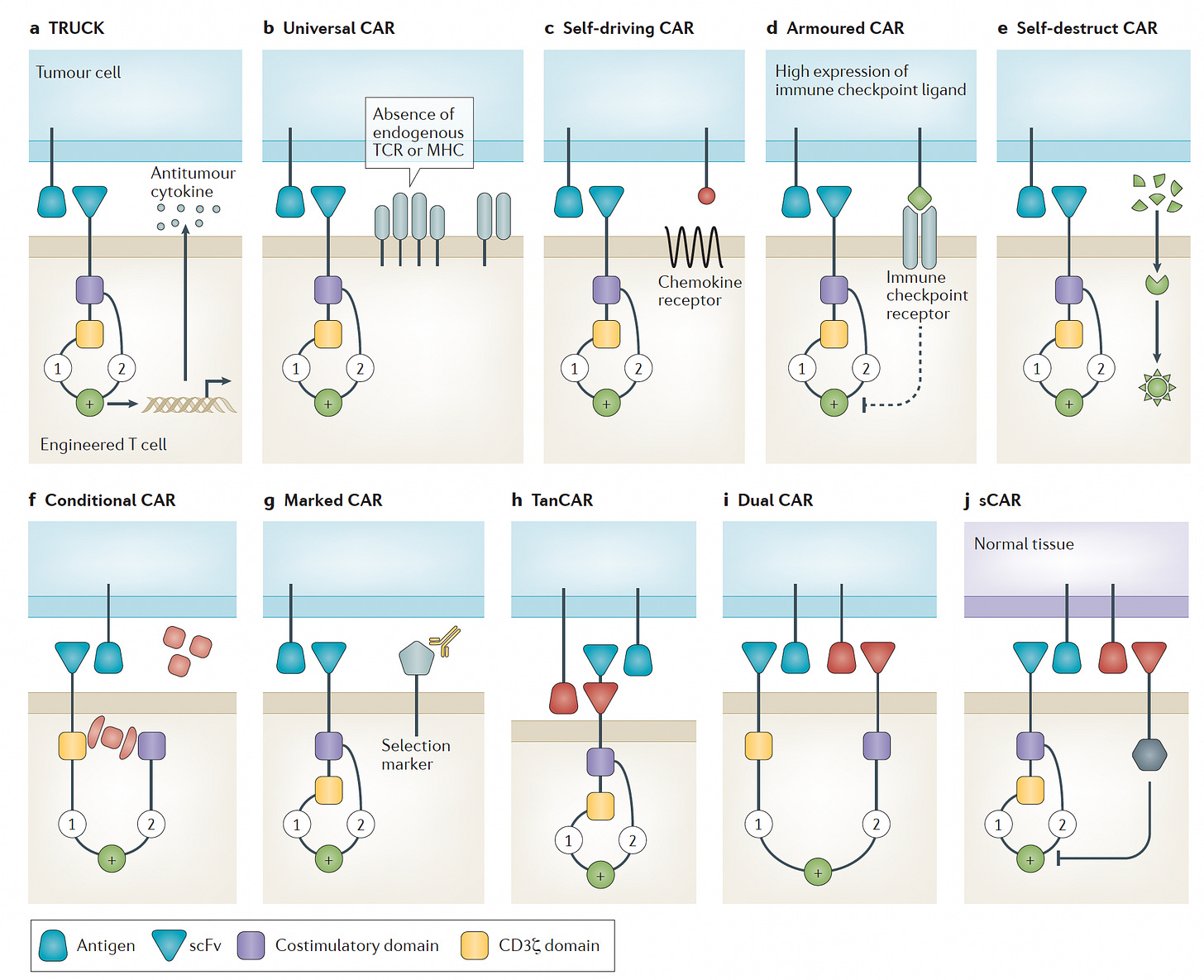 There have been several recent excellent reviews on CAR-T cell engineering for cancer here (with Figure below) and here and here. It is noteworthy to point out there’s not just one type of CAR (it’s never simple!), and I like the summary graphic below that builds on the metaphor with self-driving, armored, and other vehicles. The purpose of this post is not to review the field, but rather to point out the major points of progress that establish new directions and opportunities for this form of treatment.