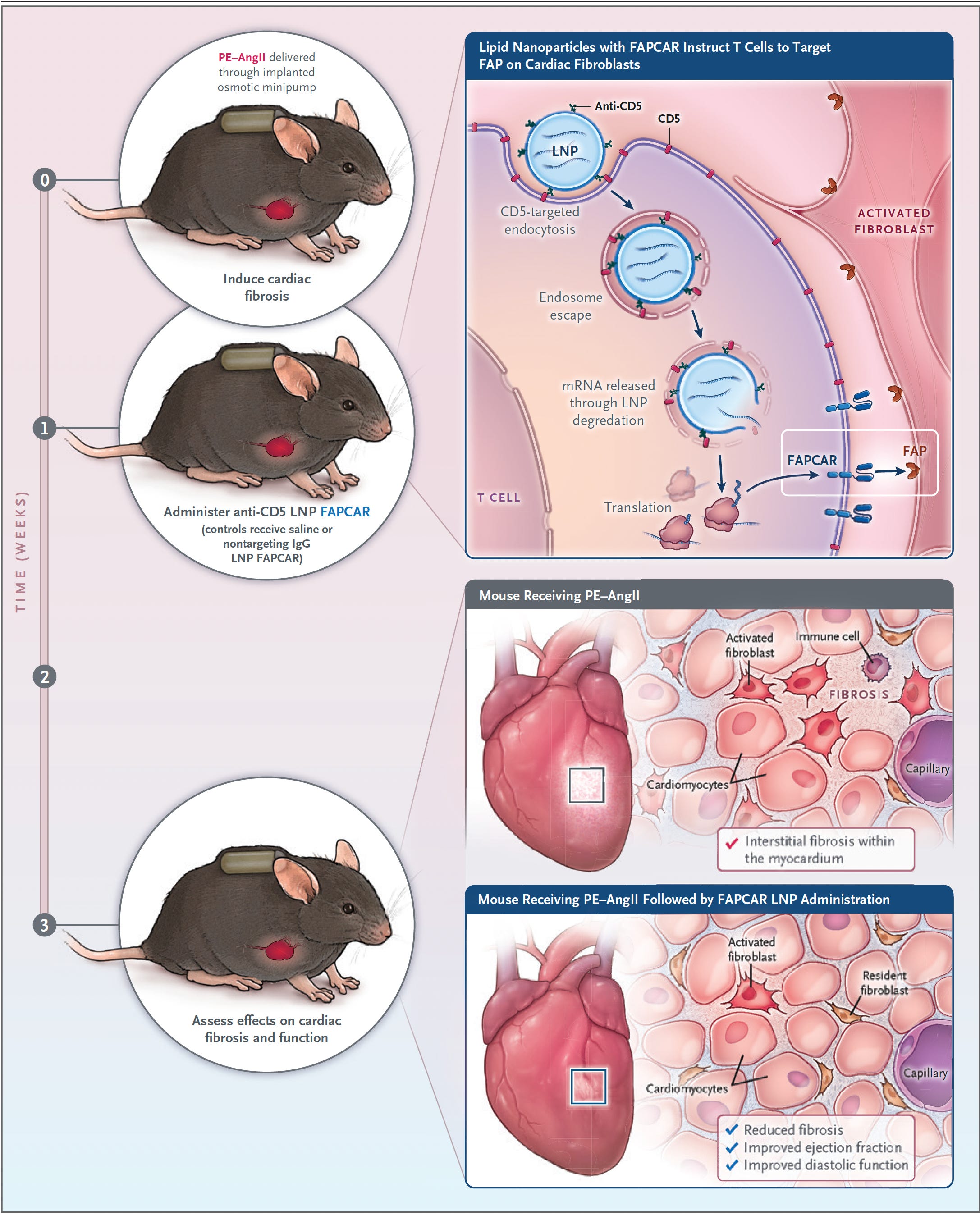 Last year there was a striking experiment in a mouse model of heart failure published in Science whereby the CAR-T cells directed against fibrosis were delivered via an mRNA-nanoparticle package. Remarkably, heart function was restored, as schematically shown below, with the scar-producing cells targeted by fibroblast-activation peptide (FAP) and shown to be cleared by the spleen.