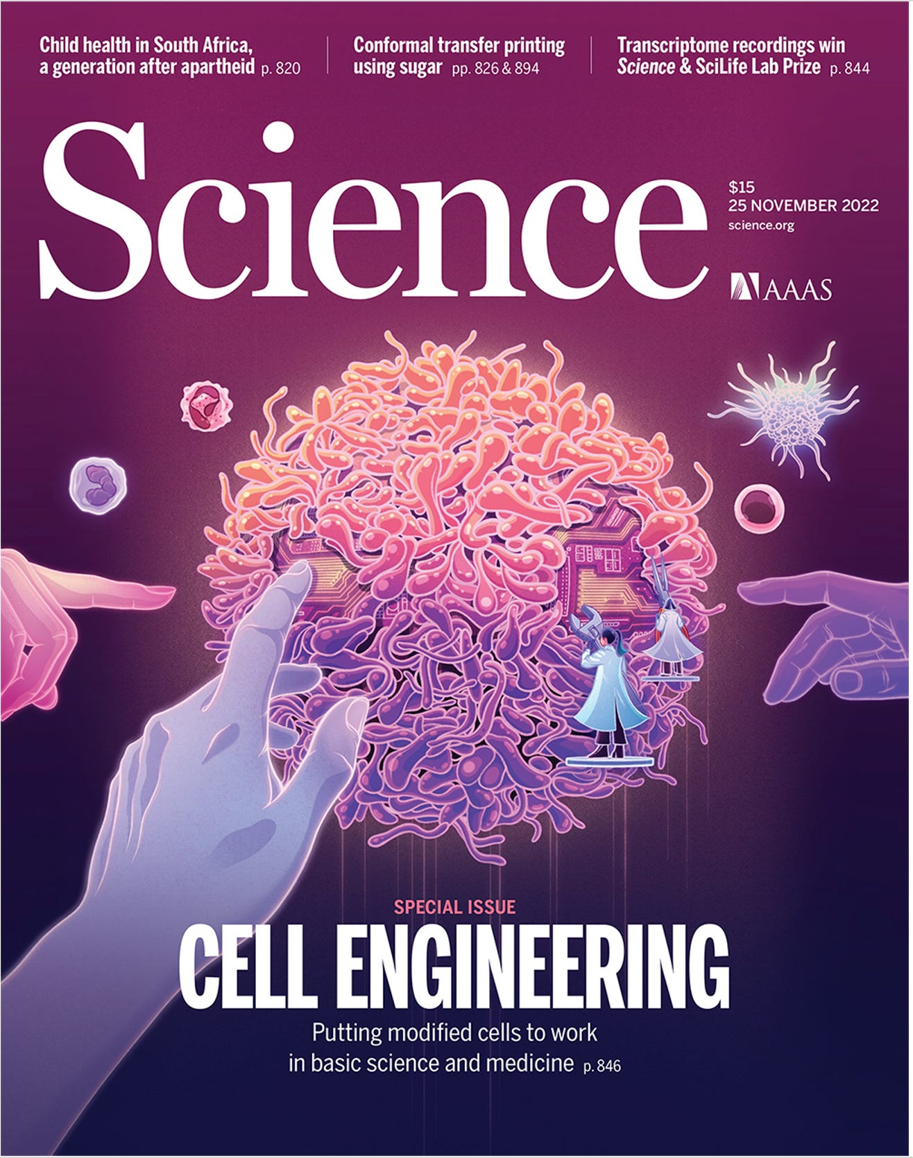 In recent months there have been some major jumps—unprecedented success stories—that indicate our ability to engineer T cells may well have a substantial impact for multiple medical conditions that have not been responsive to conventional therapies or for which there is no available treatment. This can be regarded as the quintessential individualized medicine intervention—specifically modifying the T cells so they can recognize a protein on the surface of a person’s cells— that can markedly dial up or down their immune response. As reviewed in this week’s Nature, there are over 500 clinical trials ongoing that are testing engineered T cells to build upon the first chimeric antigen receptor (CAR-T) cell treatment approved for leukemia 6 years ago. Over 20,000 people have received one of the 6 CAR-T approved therapies for “liquid” blood cancers. Two of the first patients treated with CAR-T 12 years ago for cancer are still in remission. Some of the progress has been highlighted by covers of top tier journals like the one below in Science and Siddhartha Mukherjee’s outstanding new book The Song of the Cell over the past year. It’s pretty clear that in so many ways this field is just getting started.