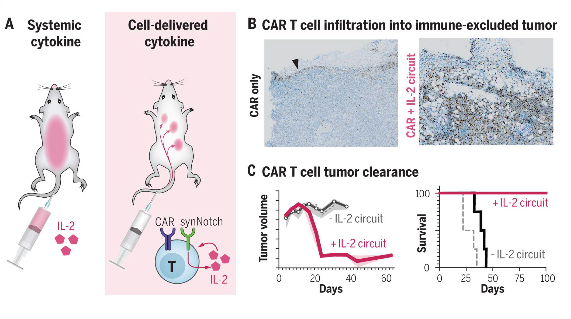 Separately, synthetic biology, via gene switches and circuits, offers another important route for enhanced T cell engineering, as recently reviewed. Just last month two reports, one from Boston University and another from UCSF (graphic below), used this strategy to dual program CAR-T cells to also produce interleukin-2 when they confront a tumor cell, an ancillary path beyond the specific antigen targeted method that can help these cells overcome tumor immune evasion. Methods to override T cell exhaustion and resistance, by disrupting the cell cycle regulators, have also been recently reported. Of course, other cell types can be engineered besides T cells, creating more auxiliary ways to intervene.