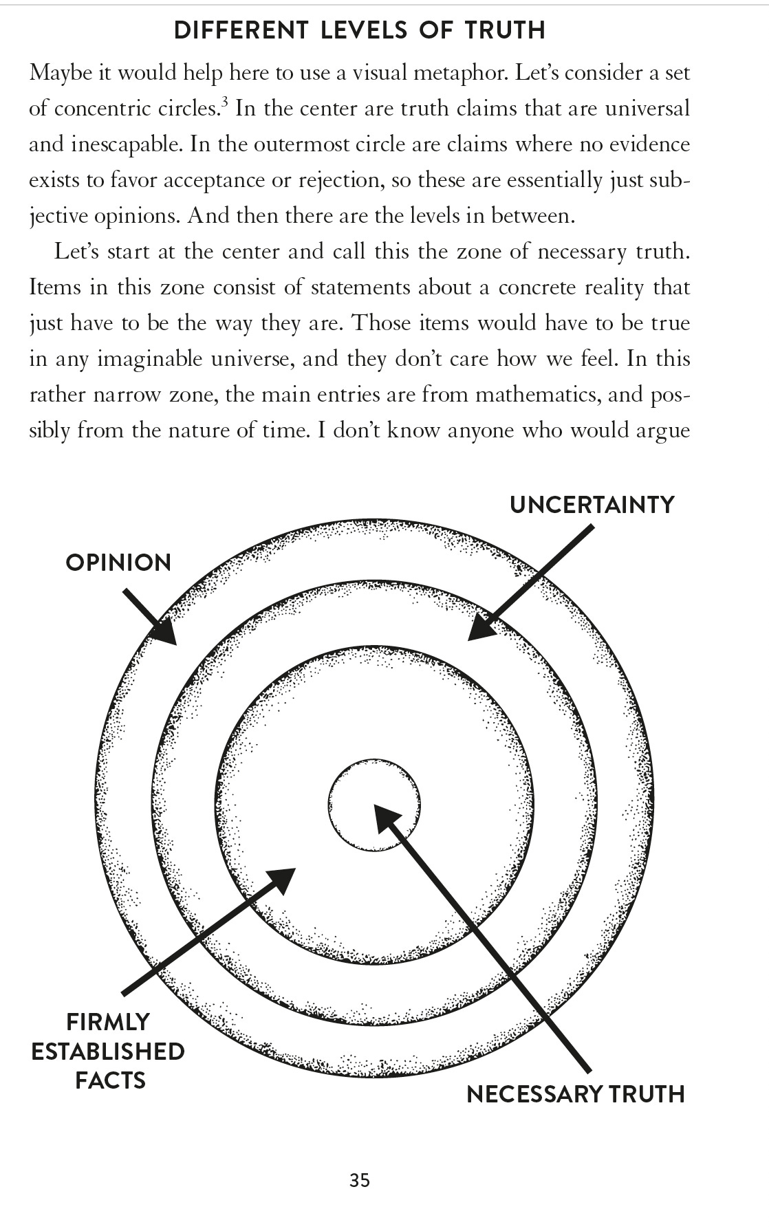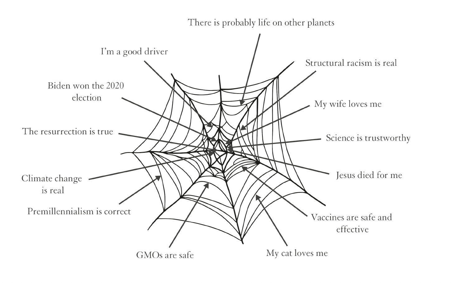 in the middle, necessary truth. And then as you go further out, firmly established facts, then uncertainty and then opinion, and truth is not a dichotomous by any means. And you really got that down and you explained each of these different facets of truth with great examples. And so, this among many other things that you broke down, it wasn't just something that you read somewhere, you really had to think this through and perhaps this experience that we all went through, but especially you. But because you bring so much of the book back to the pandemic at times with each of the four domains, so that and the spider web. The spider web of where your core beliefs