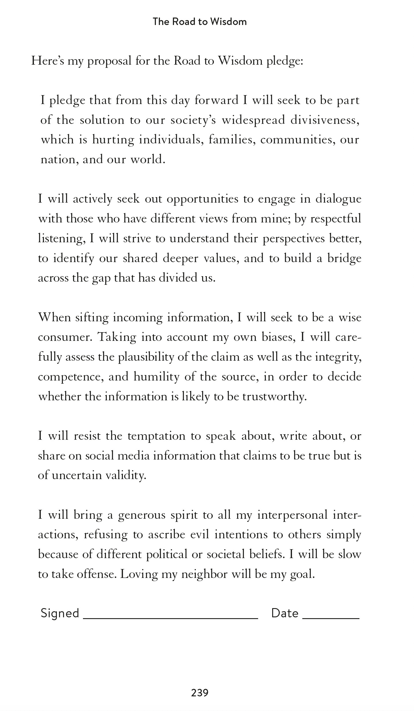 Yeah, that's fantastic. I mean, your work there alone is of monumental importance. Now I want to get back to the book the way you pulled it all together. By the way, if anybody's going to write a book about wisdom, it ought to be you, Francis. You've got a lot of it, but you had to think through how are we going to change because there's a lot of problems as you work through the earlier chapters and then the last chapter you come up with something that was surprising to me and that was a pledge for the Road to Wisdom. A pledge that we could all sign, which is just five paragraphs long and basically get on board about these four critical areas. Can you tell us more about the pledge and how this could be enacted and help the situation?