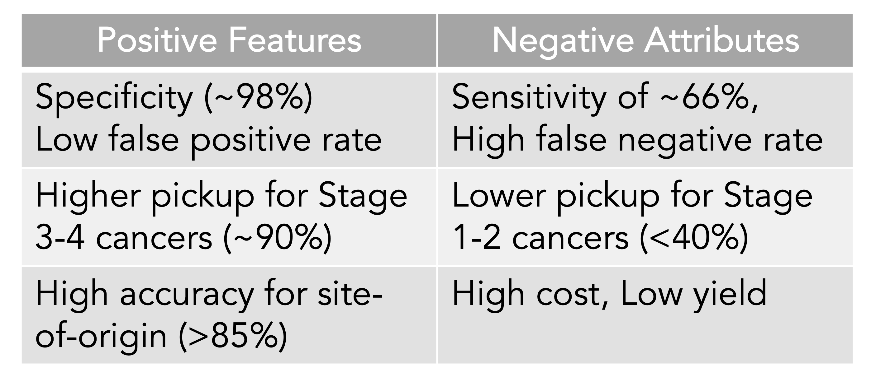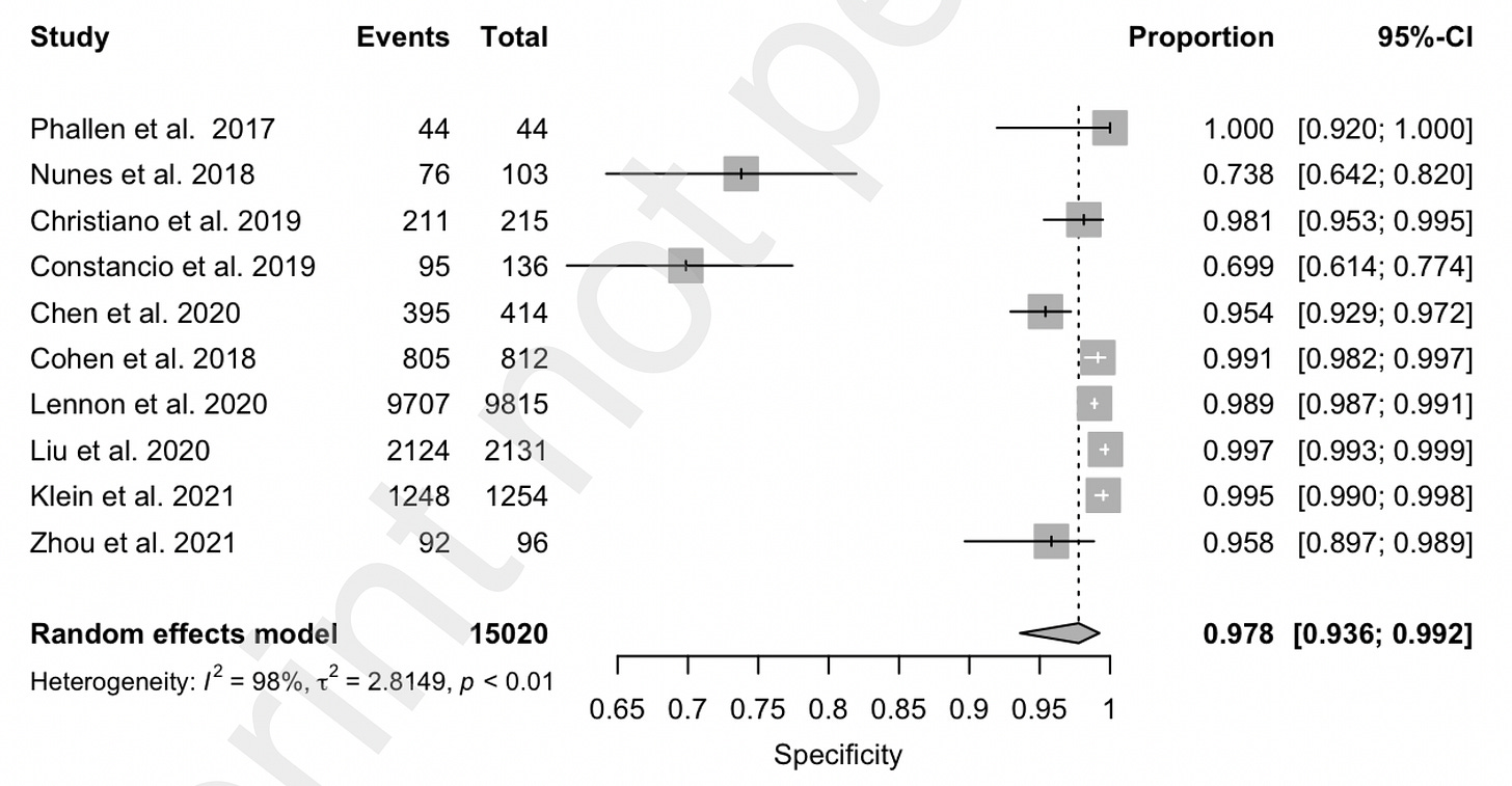 A meta-analysis of 10 case-control and 6 cohort studies for the different MCED tests came up with an overall sensitivity of 0.66 and a specificity of 0.98. That level of specificity— the true positive test—is the striking upside so far for the MCED tests, as shown below. The overall accuracy for predicting the cancer site of origin from the blood biomarker was 79%.