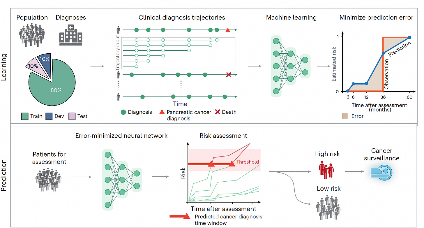 I recently reviewed the major study of AI for detecting pancreatic cancer using a transformer AI model in 2 large cohorts (Denmark and the US), in aggregate from more than 11 million people of whom 28,000 developed pancreatic cancer, one of the most deadly forms of cancer and exceedingly difficult to diagnose early. I won’t go through all the details again, but the A.I. performed well (AUC=0.88) that exceeded previous machine and deep learning models, and only incorporated minimal risk factor data derived from the history for each individual, with time-sequence data identified as particularly useful for aiding prediction. It did not include multiple other layers of data (“multimodal”), such as genomics, lab tests or scans.