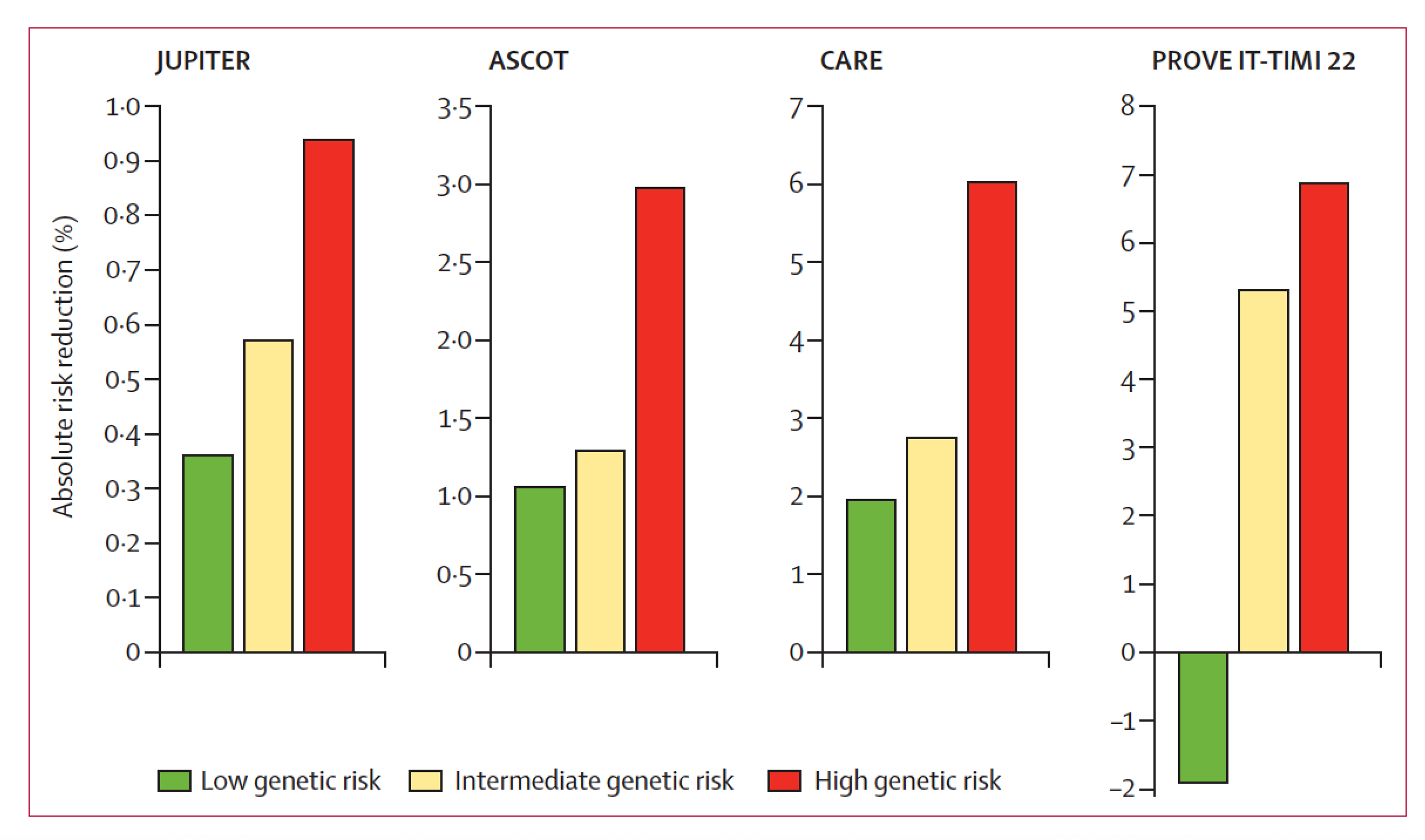Polygenic risk scores can provide information beyond risk that is actionable. In the case of heart disease, helping the decision for the use of statins has been well established for many years (Figure below), and I’ve used that in my cardiology practice in real time, during a clinic visit, for patients who have had a SNP-array using the My Gene Rank app our team developed.