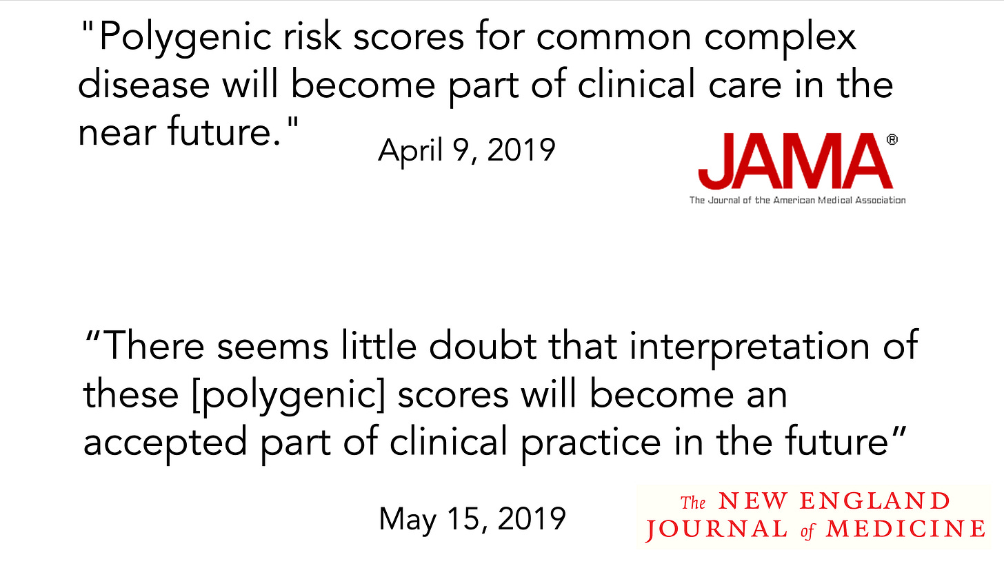 Editorials in leading medical journals in 2019 made some projections about the role of polygenic risk scores in clinical practice, as shown below.