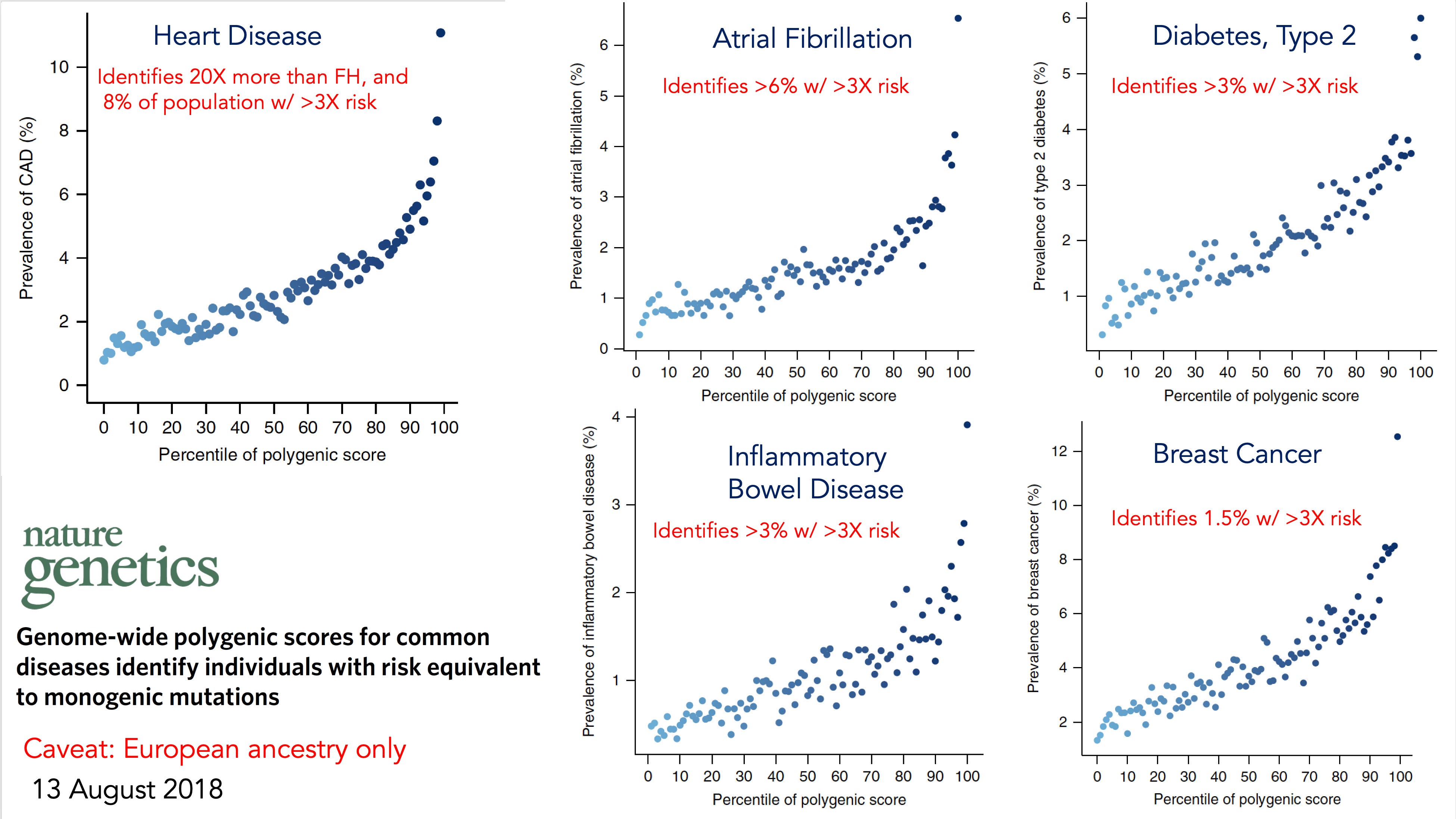 But the SNP-arrays can be used to determine polygenic risk scores for a wide variety of important and common conditions, including coronary heart disease, atrial fibrillation, breast cancer, colon cancer, prostate cancer, type 2 diabetes, inflammatory bowel disease, and many more.