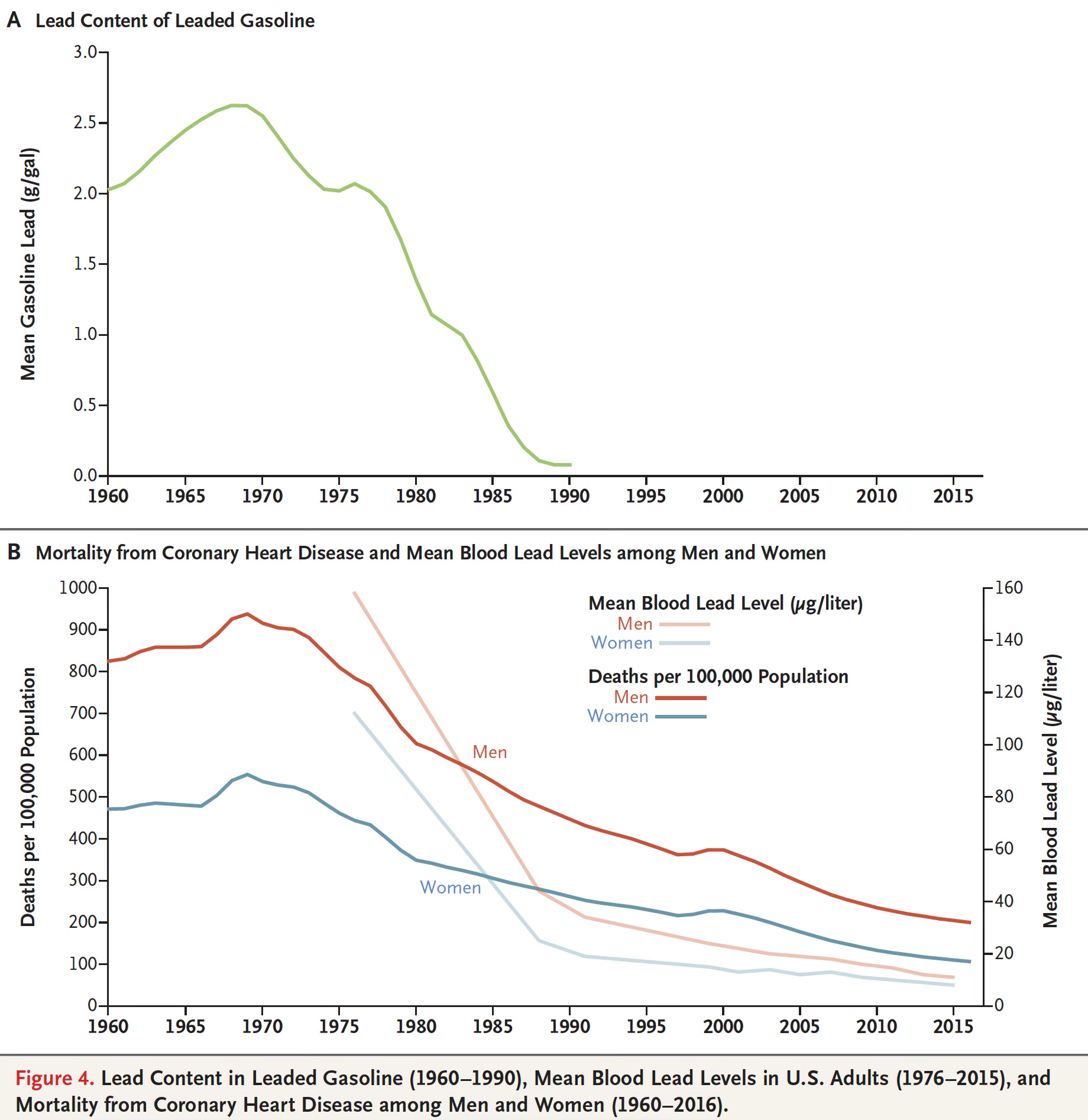 Well, as adults, if we go back in time, all of us. If you go back to the 1970s when lead was still in gasoline, the median blood lead level of Americans was about 13 to 15 µg/dL. So we've all been exposed historically to those levels, and part of the reason we've begun to see a striking decline in coronary heart disease, which peaked in 1968. And by 1978, there was a 20% decline, 190,000 more people were alive than expected. So even in that first decade, there was this striking decline in coronary heart disease. And so, in addition to the prospective studies that have found this link between an increase in lead exposure and death from cardiovascular disease and more specifically coronary heart disease. We can look back in time and see how the decline in leaded gasoline led to a decline in heart disease and hypertension.