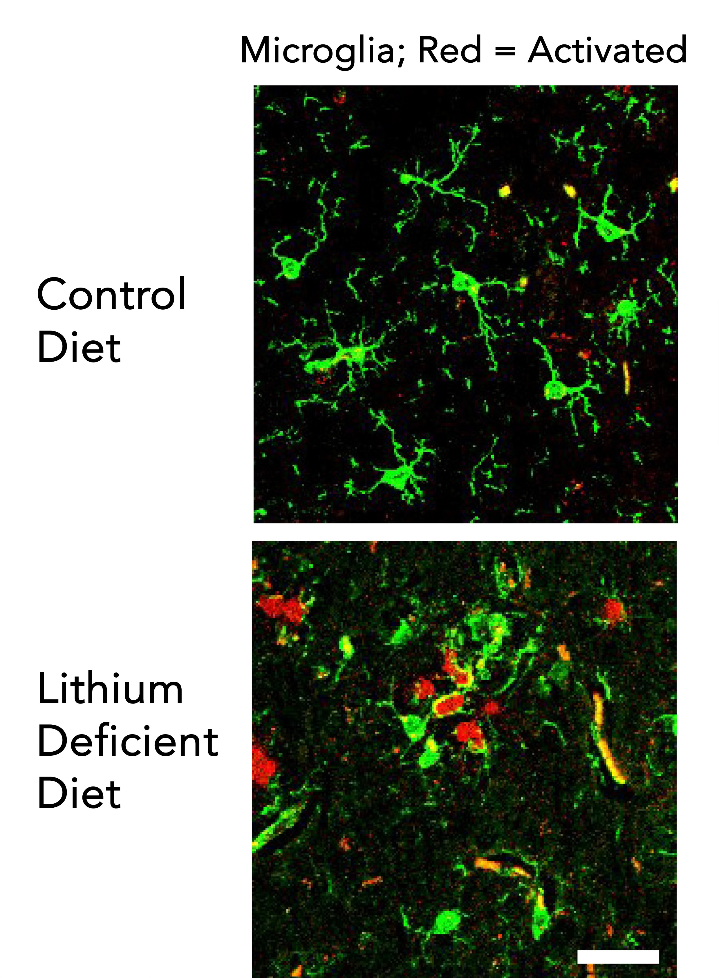 A lithium-deficient diet in the Alzheimer model mouse was pro-inflammatory with increased activated microglia (Figure also shown at the top of this post), marked accumulation of amyloid-β, and phosphorylated tau protein, loss of synapses, axons, myelin, worsened cognitive function and memory.