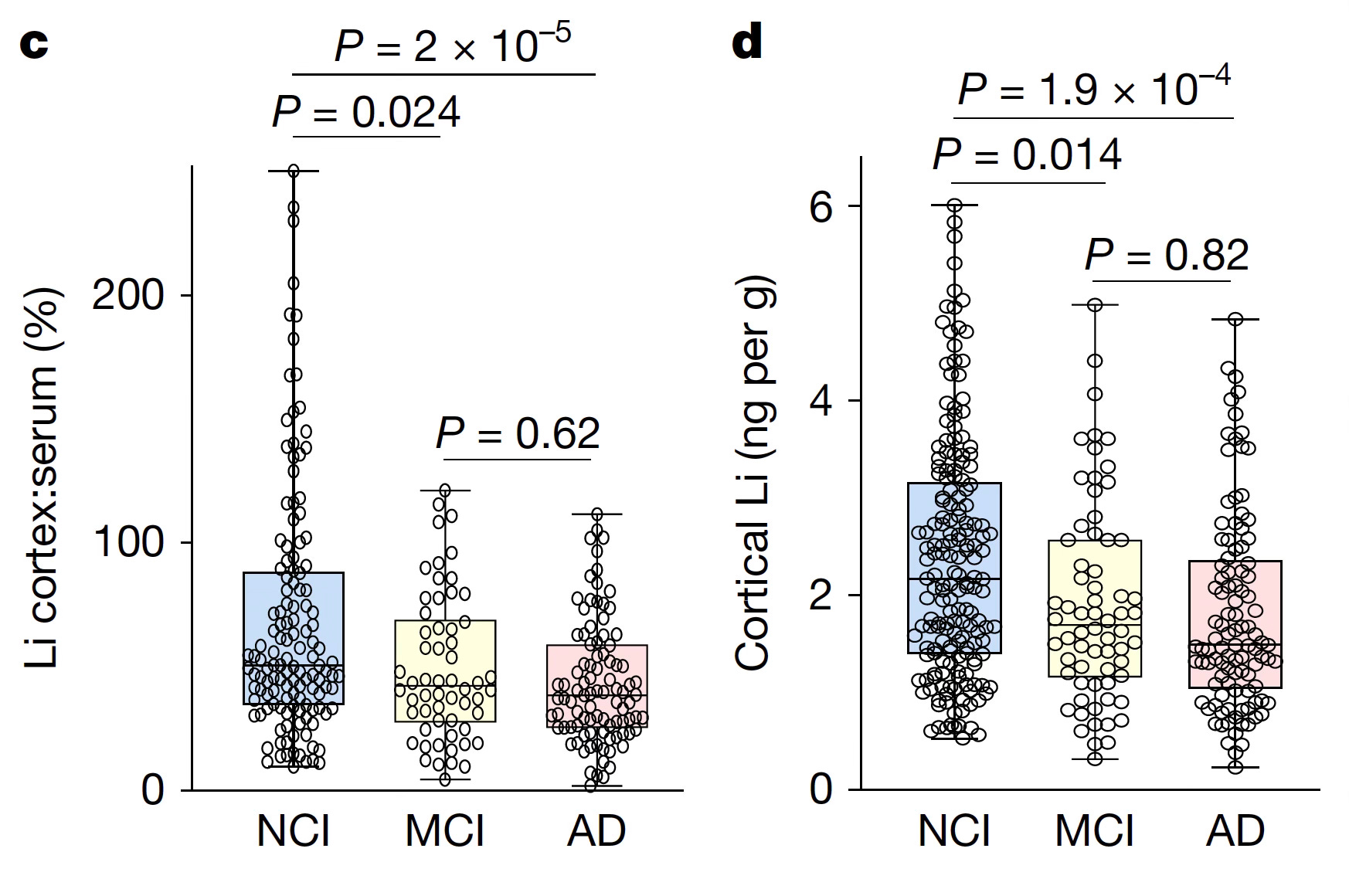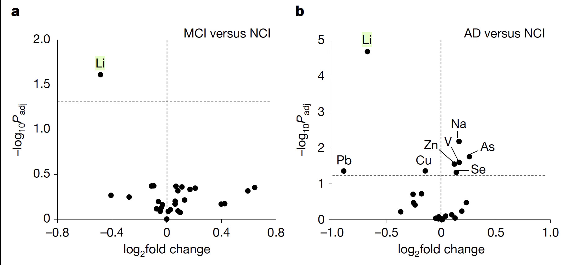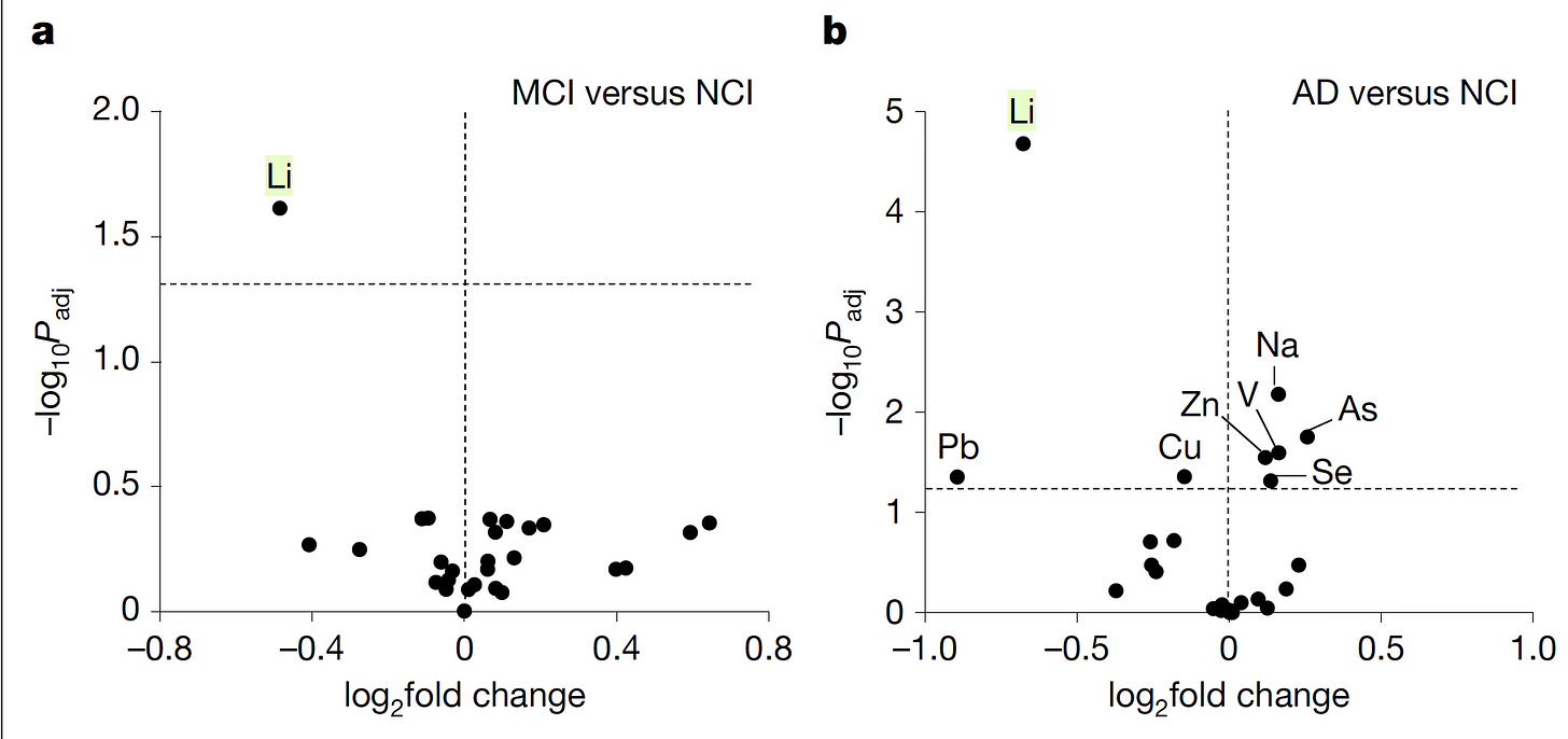 The new paper took an agnostic approach to metals in the human brain, assessing the concentration of 27 of them, and finding only that lithium (Li) stood out in both people with mild cognitive impairment (MCI) and Alzheimer’s disease (vs individuals no cognitive impairment, NCI).