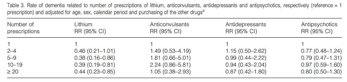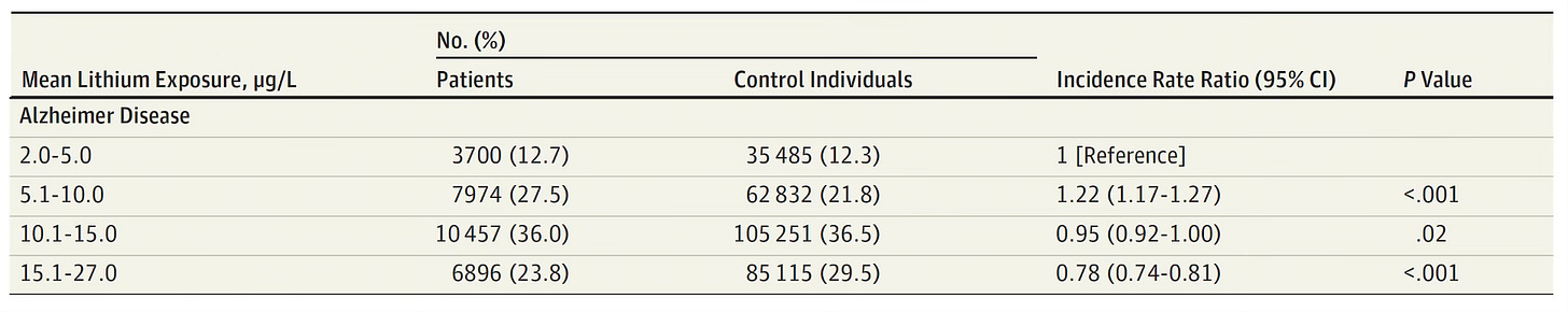 Another nationwide study from Denmark assessed lithium exposure in the water for over 73,000 people who developed dementia and over 730,000 controls. As seen in the Table below, the higher the mean lithium exposure, the more relative protection.