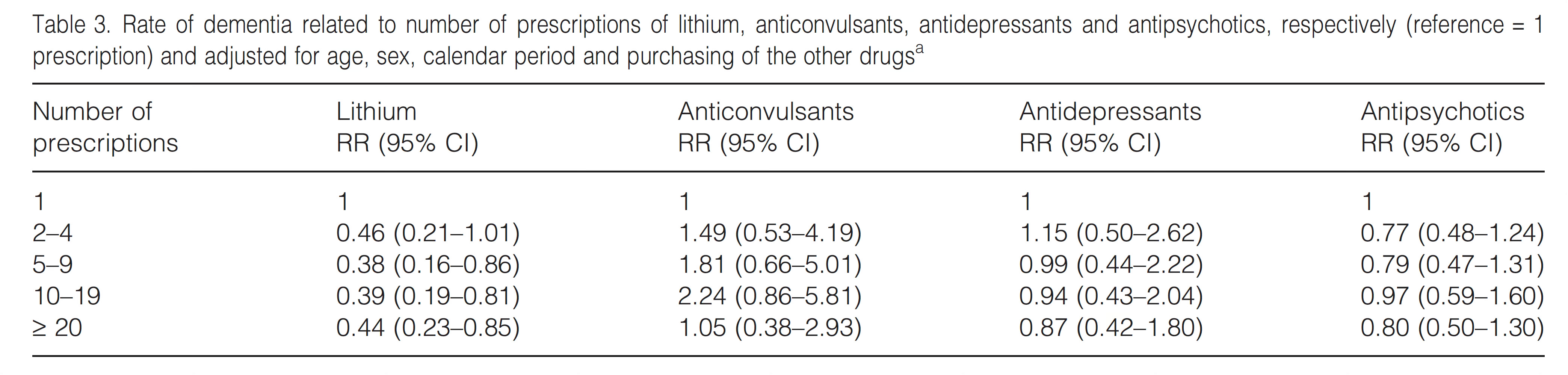 A report from Denmark of nearly 5,000 patients with BD, of whom 30% were treated with lithium, was associated with statistically significant protection from dementia, a link not seen with anticonvulsants, antidepressants, or antipsychotics. (Table below). It has been noted that lithium’s efficacy is diminished in older people with BPD, which may have something to do with the amyloid sequestration mechanism described below.