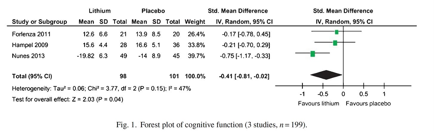 There have been 4 small placebo-controlled randomized trials, 3 of which were included in a meta-analysis, shown below for lithium’s benefit on cognitive function. Besides being very small (40 to 90 participants), the trials varied for inclusion criteria, length of drug treatment (10 weeks to 15 months), endpoints, levels of blood lithium achieved, and many other factors. The direction was towards benefit for all 3 trials, but only one on its own (Nunes 2013) was statistically significant.