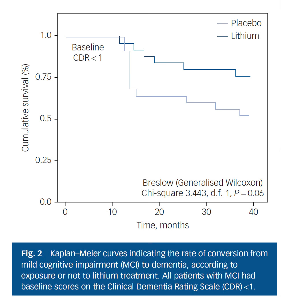 A more recent randomized, double-blinded, placebo-controlled trial published in 2019, again with a small sample of 61 participants, using lithium carbonate at low doses for 2 years, also supported the finding with less conversion from mild cognitive impairment to dementia by lithium (Figure below, NB: P=0.06 is not significant at the 0.05 level; other measures of cognitive function were statistically significant for lithium’s advantage).