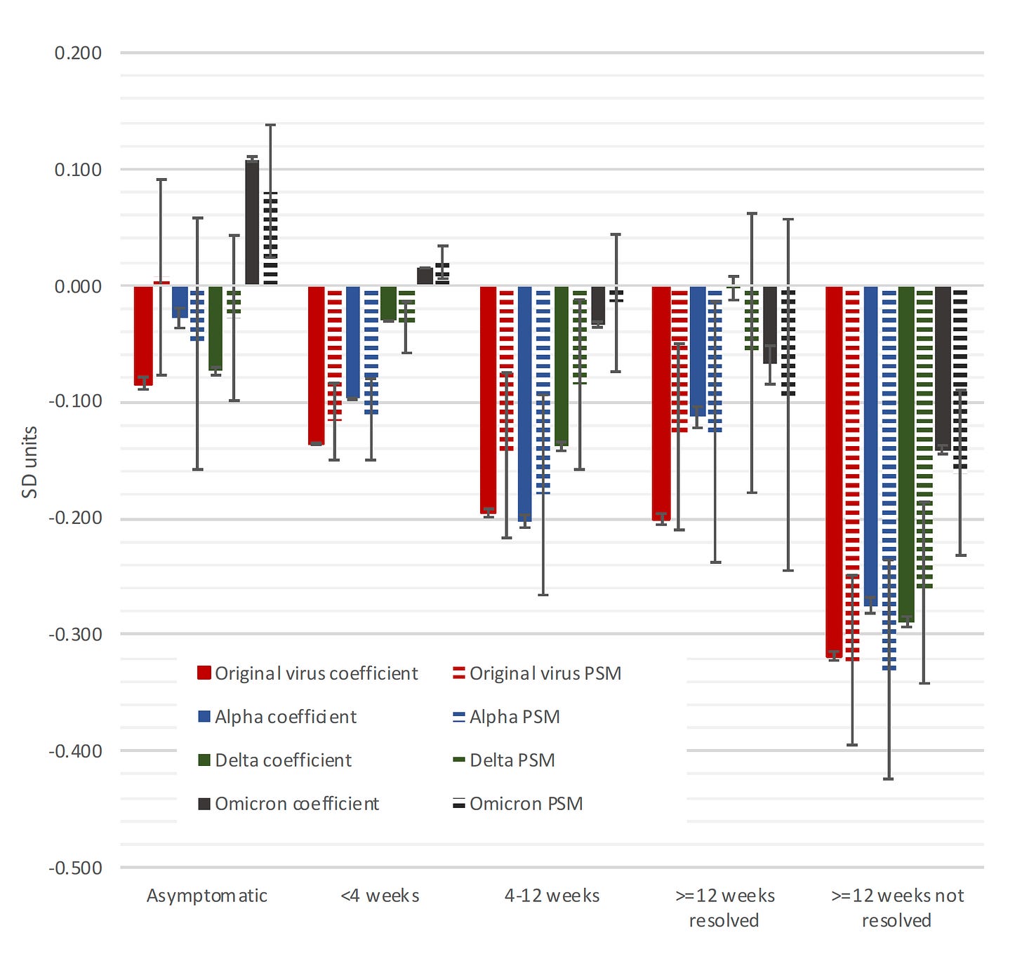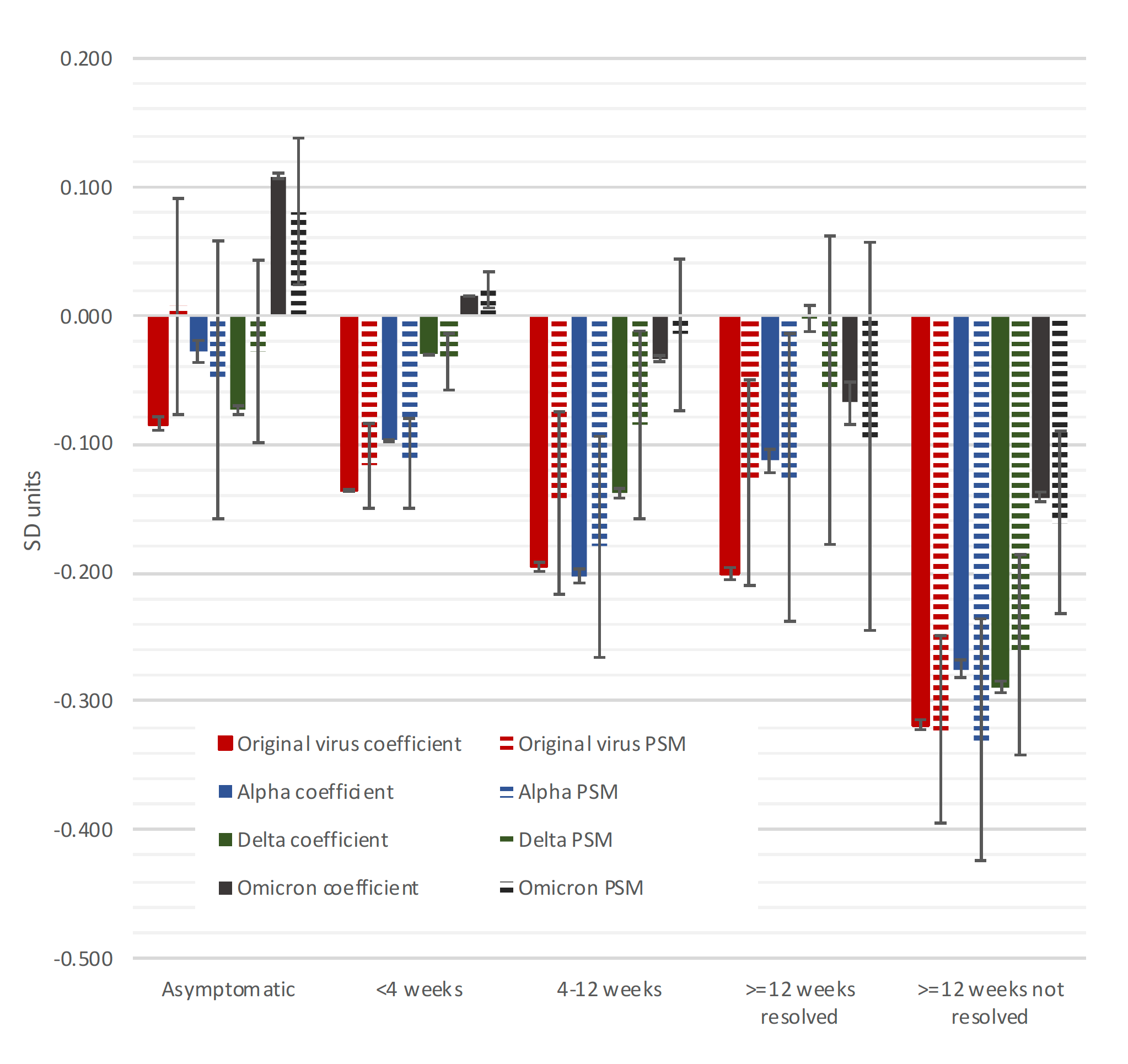 The graph below shows the cognitive decline metric at different time points, for the different variants, with or without symptom resolution.