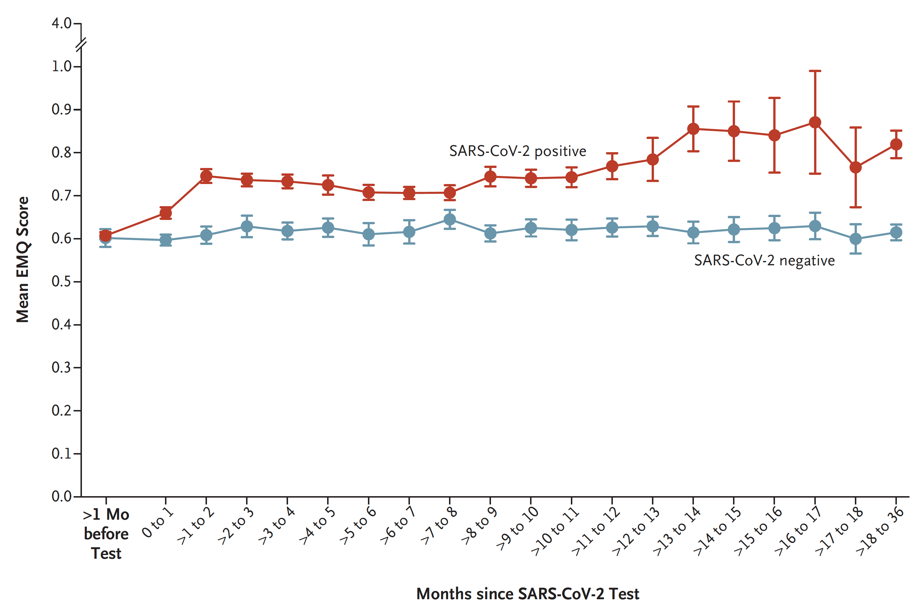 In Norway, over 134,000 participants in a nationwide study (of ~188,000 total) with Covid tests completed a 13-item memory questionnaire (EMQ, range of score 1-52 points) at baseline, pre-Covid, and subsequently at several points up to 3 years. The analysis was adjusted for age, vaccination status, co-existing conditions, and many known potential confounding characteristics. About half of the near 112,000 participants with Covid tests were either positive or negative. Before Covid, their baseline scores were the same, but as you can see in the graph below there was significant decline (point estimates with 95% confidence intervals are the vertical bars) in the participants at every time point assessed in those who tested positive for Covid during extended follow-up.